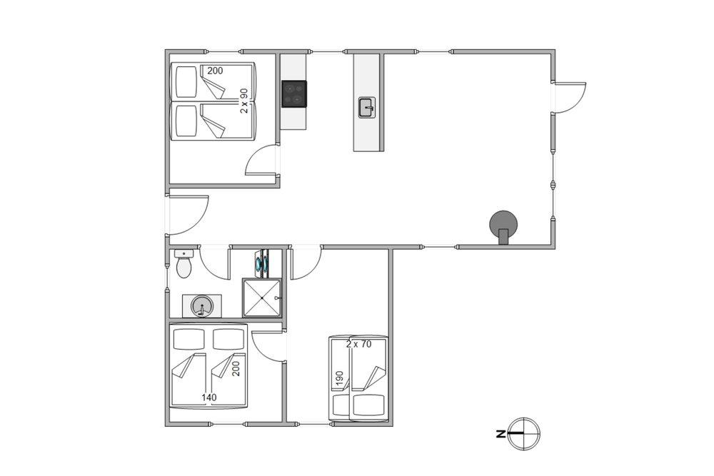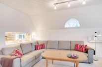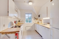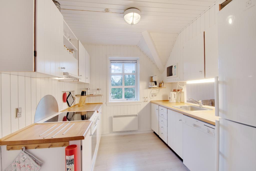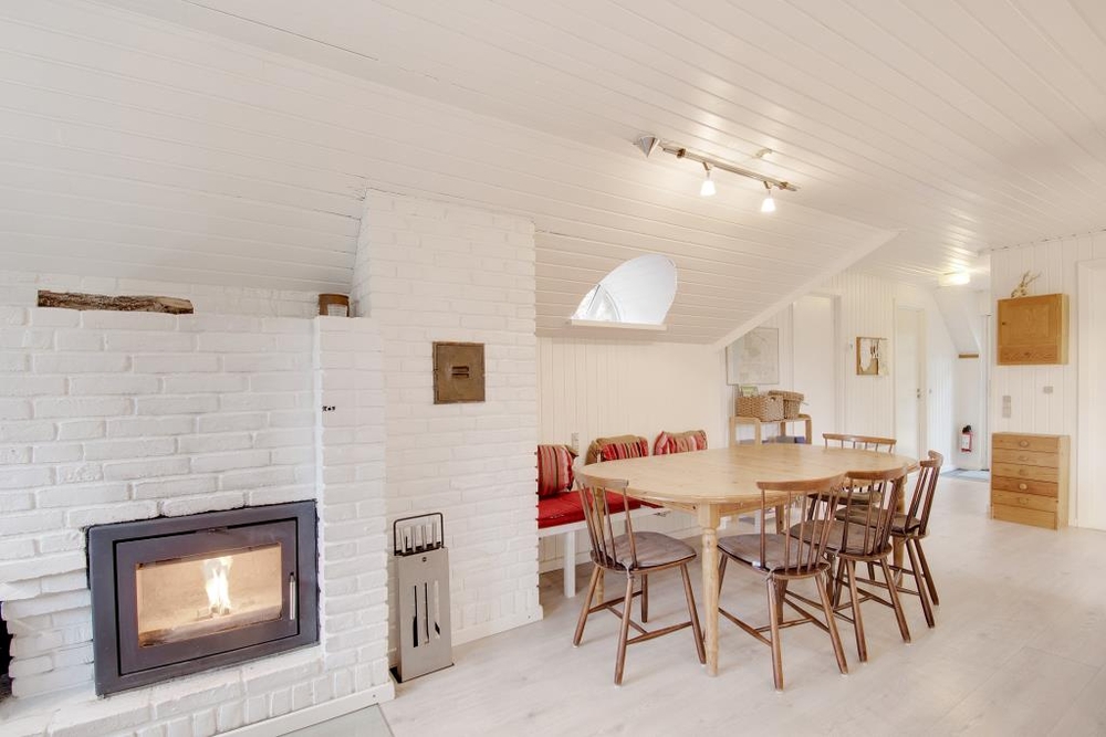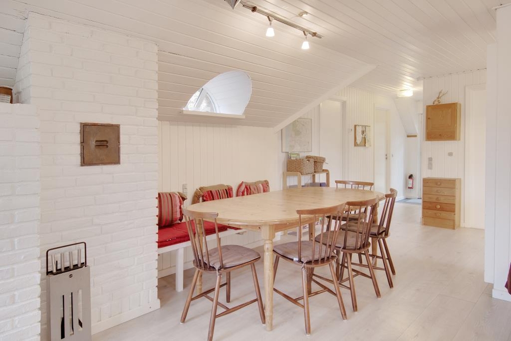 Die grosse Sofaecke lädt zu gemütlichen Stunden ein, während der eingebaute Kamin knistert, eine gute DVD im TV läuft oder ein spannendes Buch gelesen wird. Auf den bequemen Sesseln lässt es sich bei Musik und Unterhaltung bestens im Urlaub an der Westküste Dänemarks entspannen. Am langen Esstisch kann in lustiger Runde Karten gespielt und die gemeinsam zubereiteten Mahlzeiten genossen werden. Dafür bietet die gut ausgestattete Küche die richtigen Möglichkeiten. Neben einer grossen Kühl-Gefrier-Kombination sind Mikrowelle, Geschirrspüler und ein guter Herd mit Backofen vorhanden.
