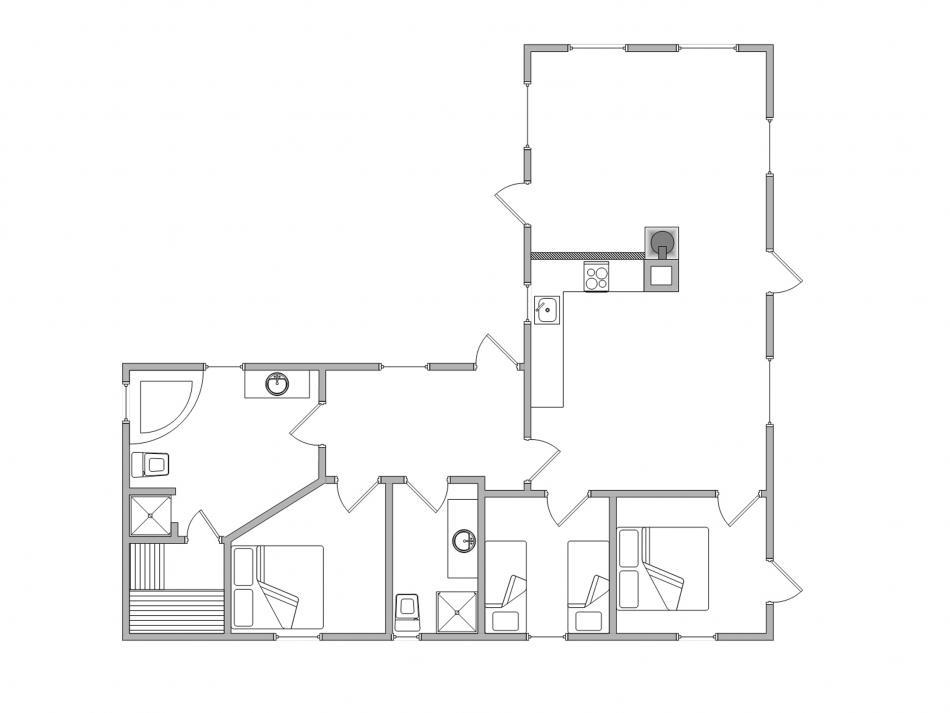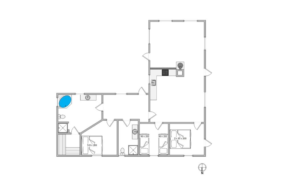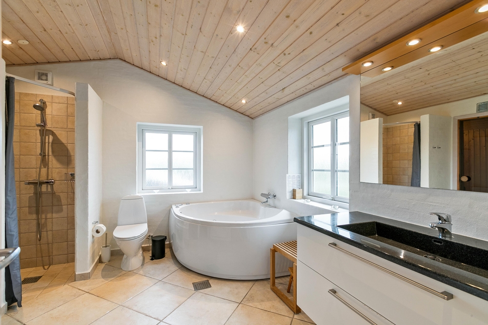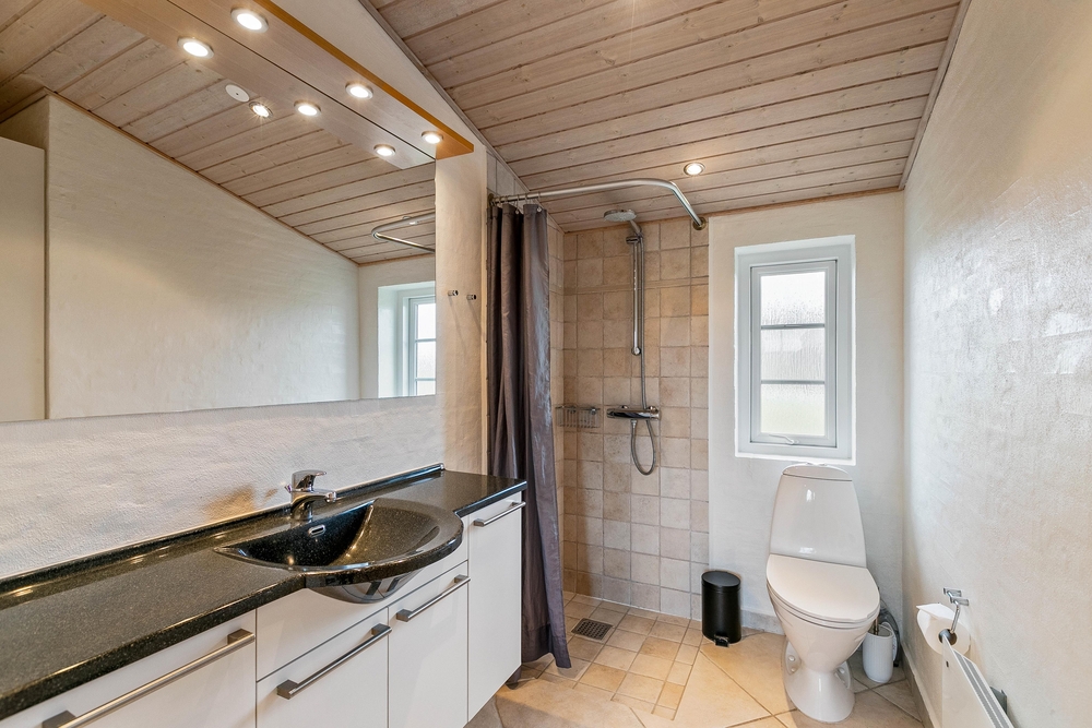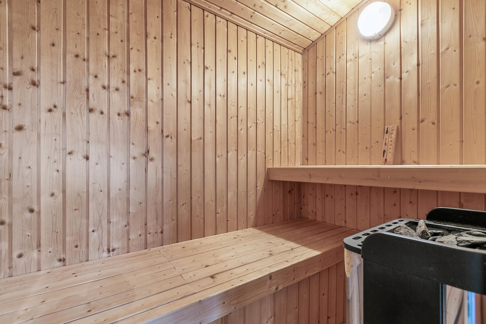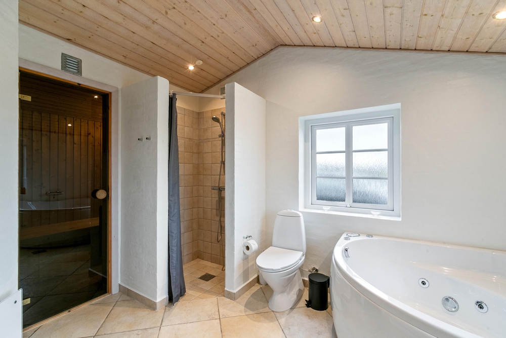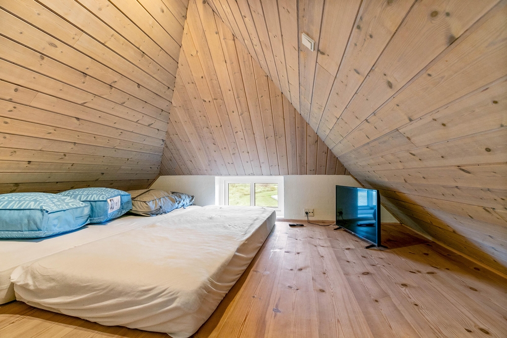 Es gibt 3 Schlafzimmer, von denen 2 Zimmer mit Doppelbetten ausgestattet sind, und das dritte Zimmer mit 2 Einzelbetten. Zwei zusätzliche Schlafplätze befinden sich etwas versteckt unter dem Dach und sind meistens für Kinder ein besonderes Erlebnis und ein schöner Rückzugsort. Die 2 schönen Badezimmer sind gut ausgestattet und werden mit einer Fußbodenheizung beheizt. Das größere Bad kann mit einem kleinen Wellnessbereich auftrumpfen. Es verfügt über einen Whirlpool für 2 Personen und hier befindet sich auch der Zugang zur Sauna. Wenn ihr euch von eurem stressigen Alltag erholen und entspannen möchtet, seid ihr hier genau richtig.