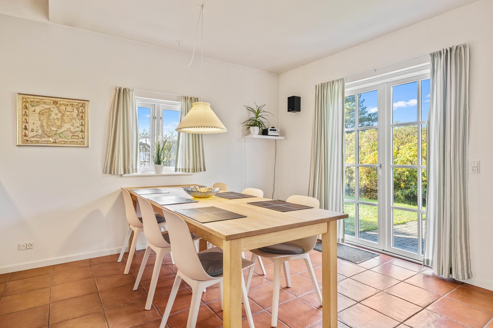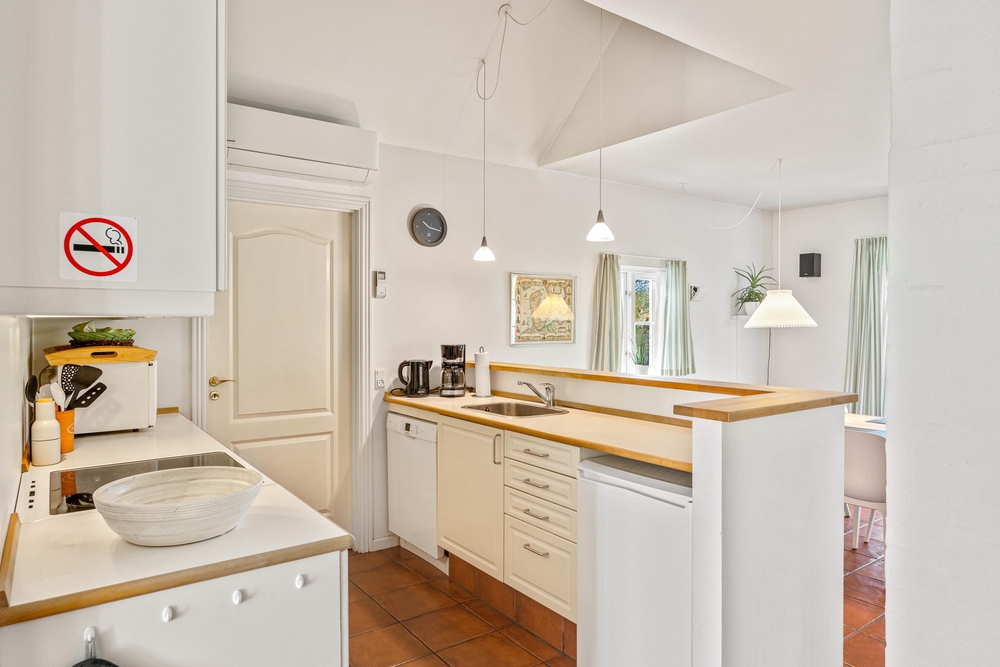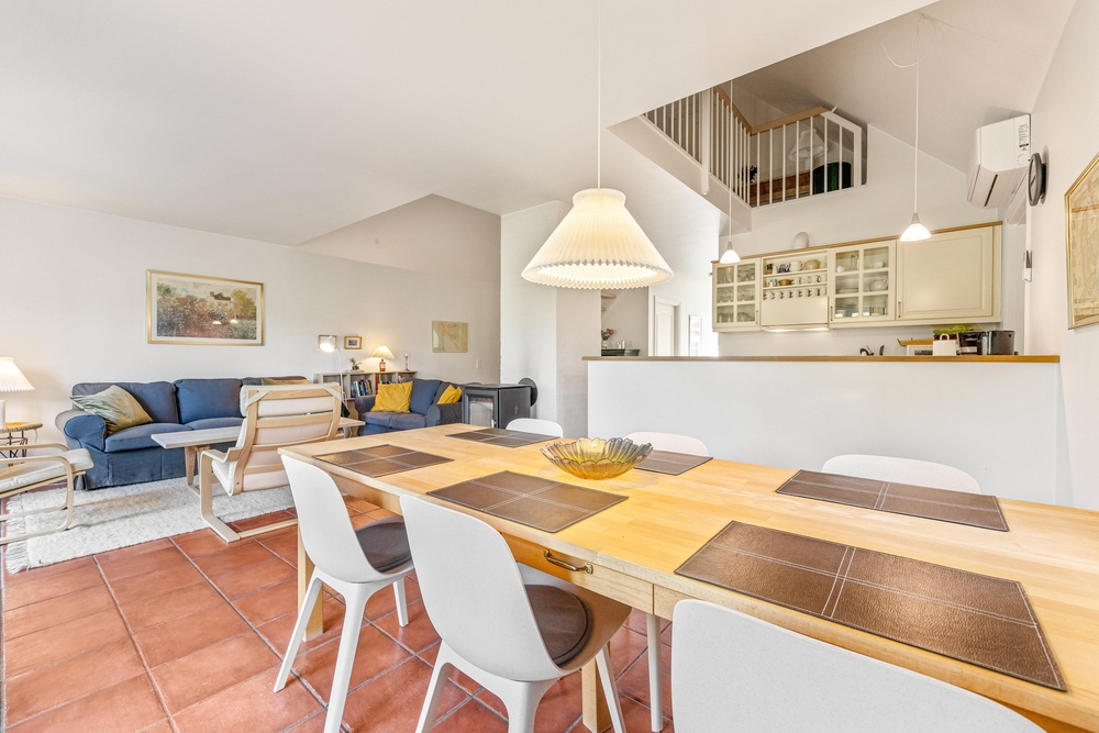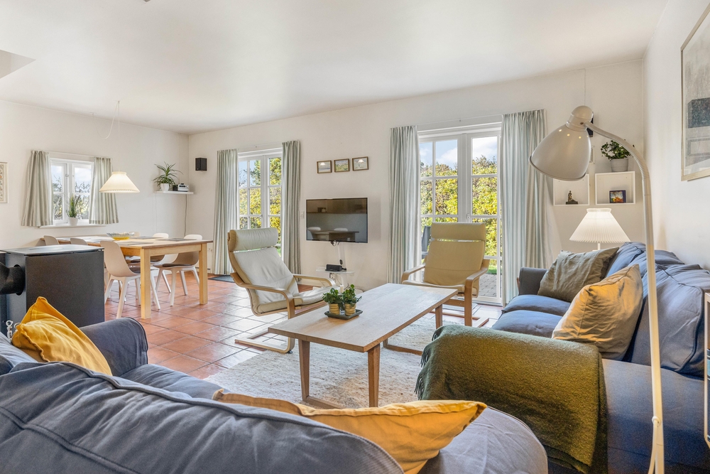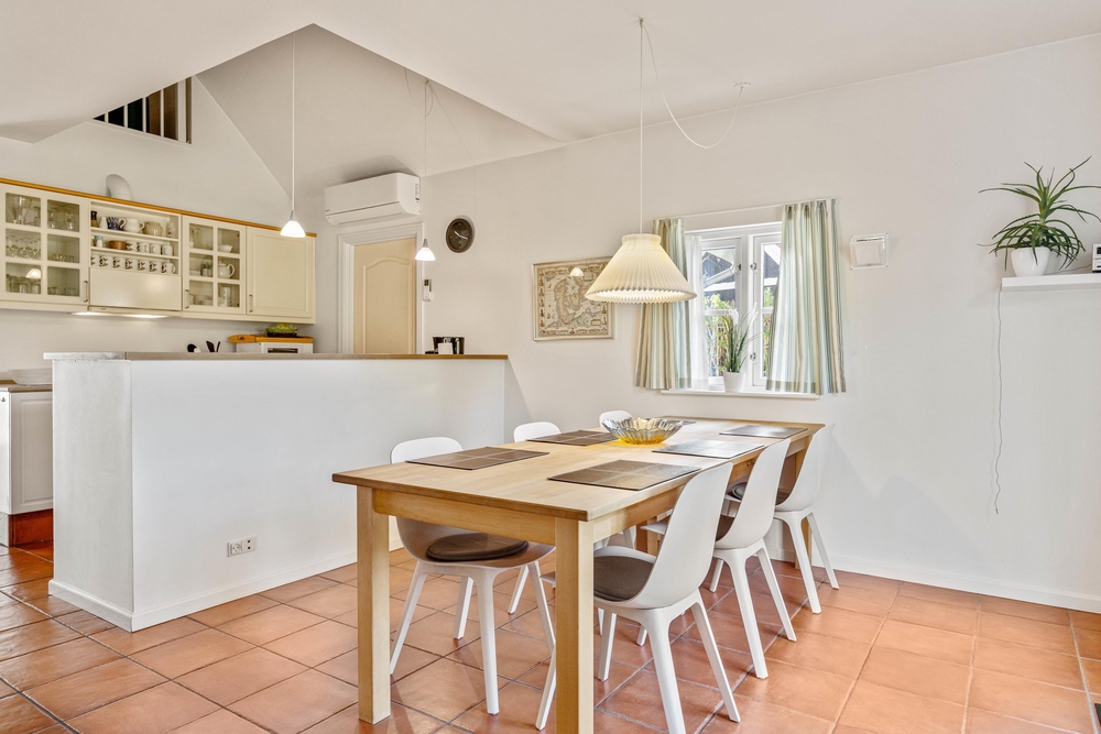 Im offenen Wohnbereich mit Kaminofen könnt Ihr das typisch skandinavische Wohngefühl erleben. Wenn alle zu gemütlichen Stunden bei einem leckeren Essen, oder einem Spieleabend zusammenkommen, oder einfach vor dem knisternden Kaminfeuer ein Glas Wein genießen, dann ist man im Dänemark Urlaub angekommen.