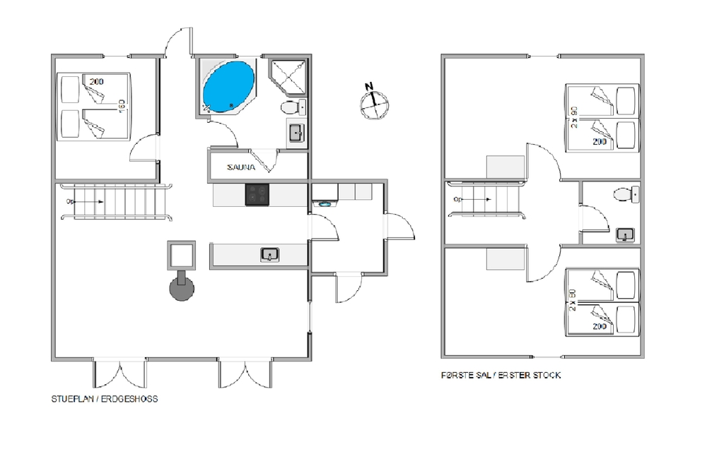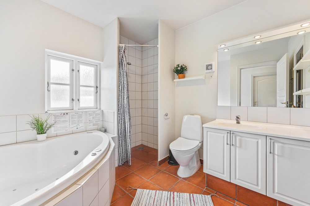 Für ein bisschen Wellnessprogramm ist mit Sauna und Whirlpool auch gesorgt. Nach einem langen Spaziergang in der schönen Natur der dänischen Westküste, könnt Ihr Euch in der Sauna wieder aufwärmen, oder im sprudelnden Wasser des Whirlpools entspannen. Im Obergeschoß gibt es zusätzlich eine Gästetoilette.