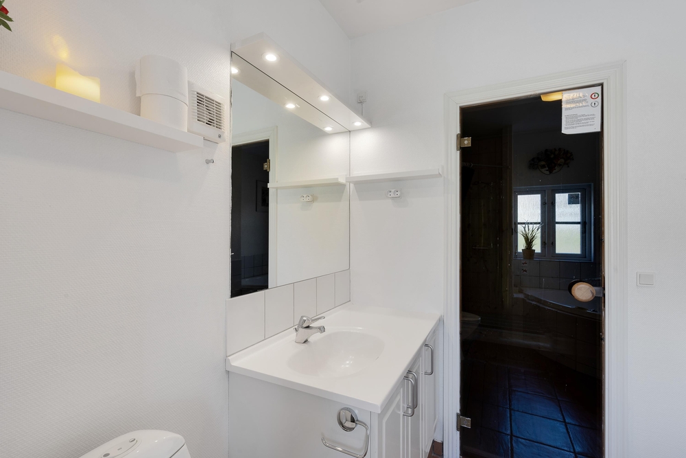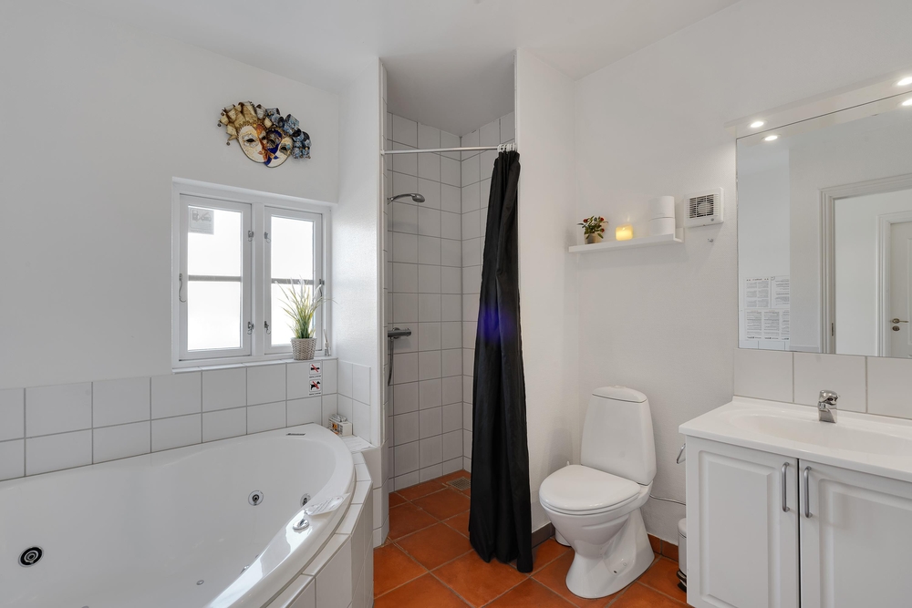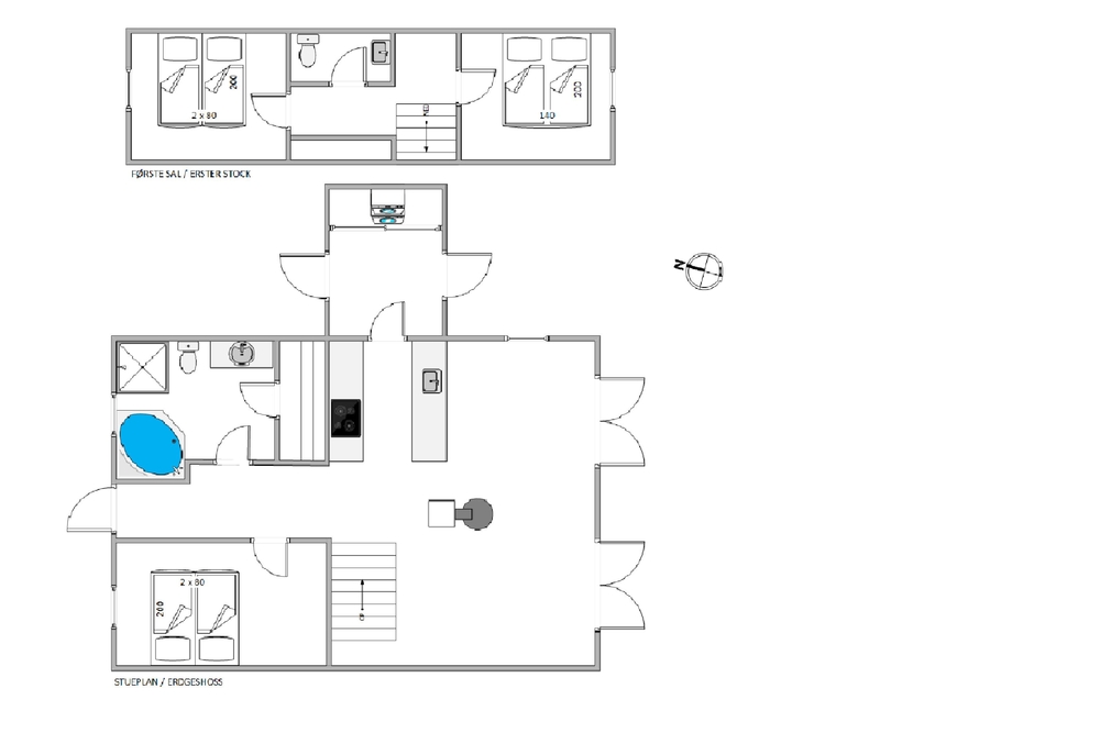 Im Badezimmer des Ferienhauses ist eine angenehme Fußbodenheizung installiert. Sauna und Whirlpool kommen dem Bedürfnis nach wohltuender Wärme nach und werden ihren Teil dazu beitragen, dass ihr abends in euren kuscheligen Schlafräumen ? einer im Erdgeschoss, die beiden anderen im Obergeschoss ? tiefenentspannt in den neuen Tag hineinschlummert. In der ersten Etage befindet sich außerdem eine Gästetoilette.