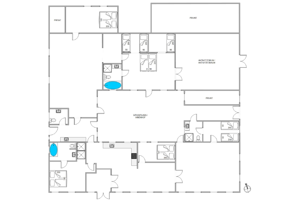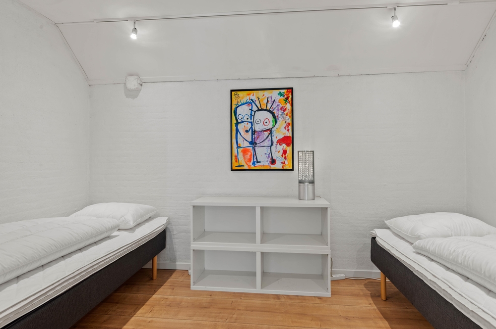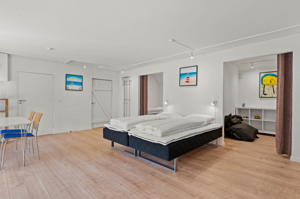 In dem 350 m2 großen Ferienhaus gibt es 12 Betten, verteilt auf 7 Schlafzimmer mit insgesamt 3 Doppelbetten und 6 Einzelbetten. Ein Schlafzimmer ist mit zwei weiteren Schlafzimmern verbunden, was sich perfekt für eine Familie oder für alle Kinder eignet, wo diese ihr eigenen Reich haben. Perfekt für eine große Gruppe stehen insgesamt 3 Badezimmer (eines davon mit Fußbodenheizung) + 1 Gästetoilette zur Verfügung.