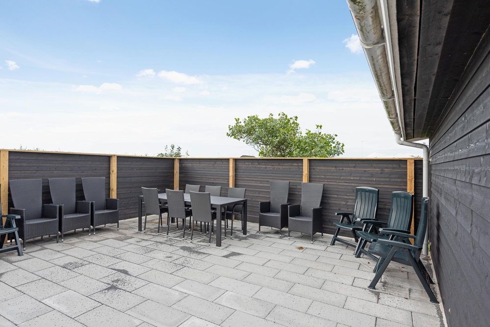 Von dem offenen Aufenthaltsraum könnt ihr direkt auf die östlich gelegene Terrasse gehen, die von beiden Seiten abgeschirmt ist. Dort stehen Gartenmöbel und Liegestühlen, damit ihr schon morgens die Sonnenstrahlen richtig genießen könnt. Um das Grundstück mit der umliegenden Natur noch besser zu vereinen, wurde auf dem Grundstück ein kleiner Teich angelegt.