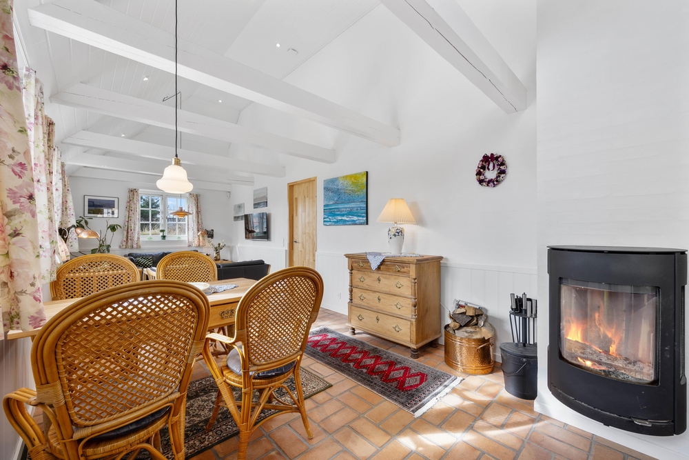 Der moderne Dünenhof mit Atriumhof ist der ideale Platz, um vom hektischen Alltag Abstand zu gewinnen und sich in dieser Wohlfühlatmosphäre zu entspannen. Die Küche, der Essbereich und das Wohnzimmer bilden eine Einheit, in der sich die ganze Familie wohlfühlen kann, sei es beim Kochen, beim Genießen einer köstlichen Mahlzeit oder beim Entspannen auf dem Sofa. Der Kaminofen sorgt für Wärme und eine besonders gemütliche Urlaubsatmosphäre.