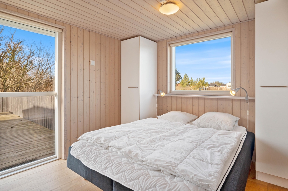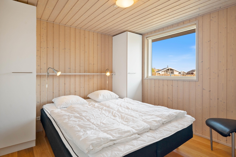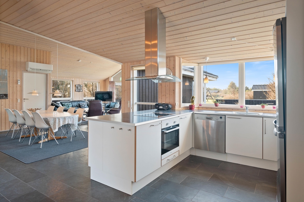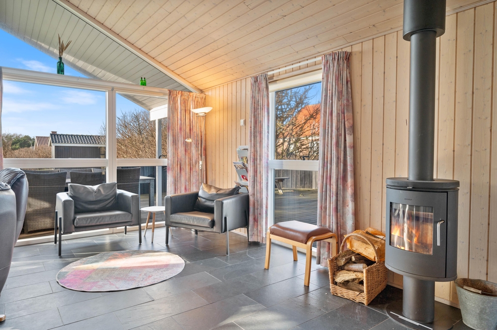 Dieses besonders schön eingerichtete und gut ausgestattete Ferienhaus ist genau richtig für gelungene Familienferien an der Westküste. Dieses Ferienhaus ist hell und einladend eingerichtet mit holzverkleideten Wänden und Decken und einem schicken, praktischen Fliesenboden. Die moderne und funktionelle Küche mit unter anderem großen 60 Liter-Gefrierschrank ist offen mit Ess- und Wohnbereich mit Kamin verbunden, welche beide besonders geschmackvoll und elegant möbliert sind. Für Kinder sind 2 Hochstühle vorhanden und auf dem gemütlichen Schlafboden (Hems) kann man sich im Laufe des Tages bei einem schönen Film entspannen, hier ist ein extra DVD-Player vorhanden. Das Haus ist sehr energiefreundlich durch die Isolierung nach neustem Standard. Es sind 4 gute Schlafzimmer und ein schöner Wellness-Bereich mit Sauna und Whirlpool vorhanden.