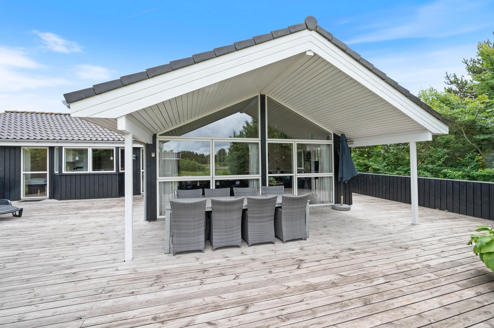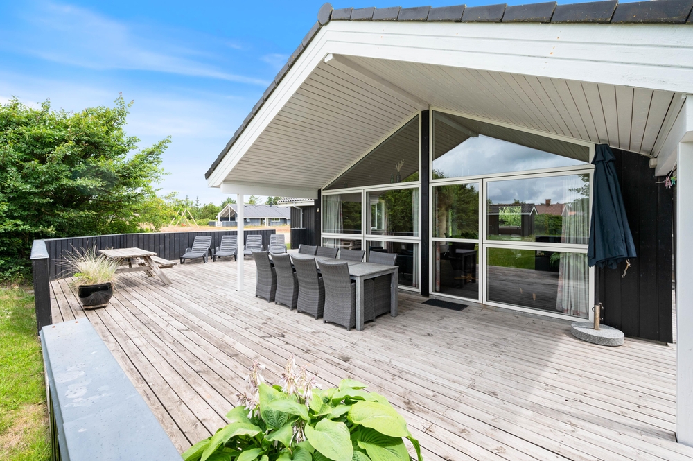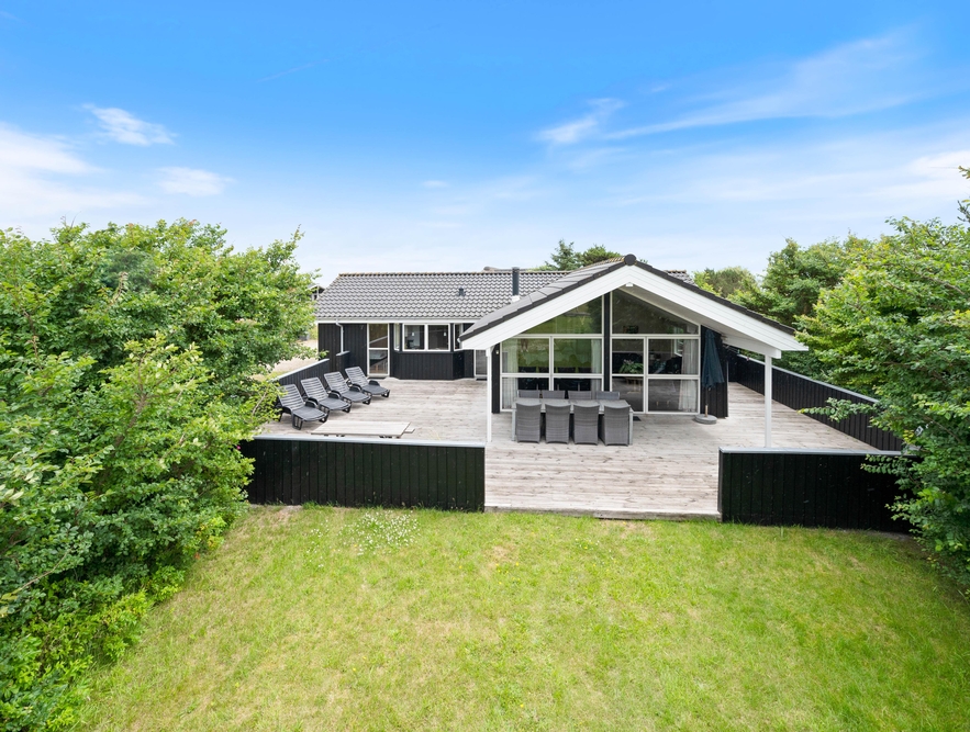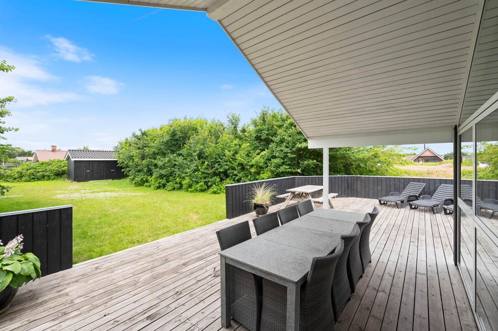 Schöne und ruhige Lage auf einem guten Grundstück, umgeben von niedrigen Büschen in der naturschönen Umgebung an der Westküste Dänemarks. Die große, gut möblierte Terrasse erstreckt sich nach Osten, Süden und Westen, so dass Ihr die Sonne und die frische Meeresluft den ganzen Tag lang genießen könnt ? und für die kulinarische Herausforderung ist natürlich auch ein Grill vorhanden. Die Terrasse ist zudem teilweise abgeschirmt und überdacht. Hier könnt Ihr es sich wirklich gemütlich machen und entspannen.