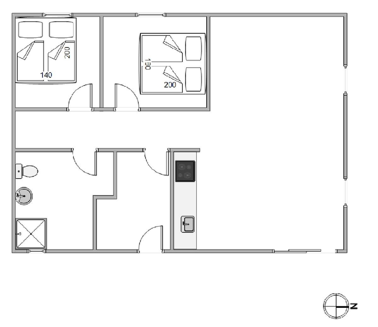 Die Küche ist klein aber fein, gut ausgestattet und so gestaltet, dass ihr beim Kochen auch am Geschehen im Wohnbereich teilhaben könnt. Nach dem Essen kann der Geschirrspüler den Abwasch für euch übernehmen. Darüber hinaus gibt es 2 Schlafzimmer mit Doppelbetten und ein Badezimmer mit Dusche und Fußbodenheizung.