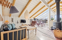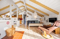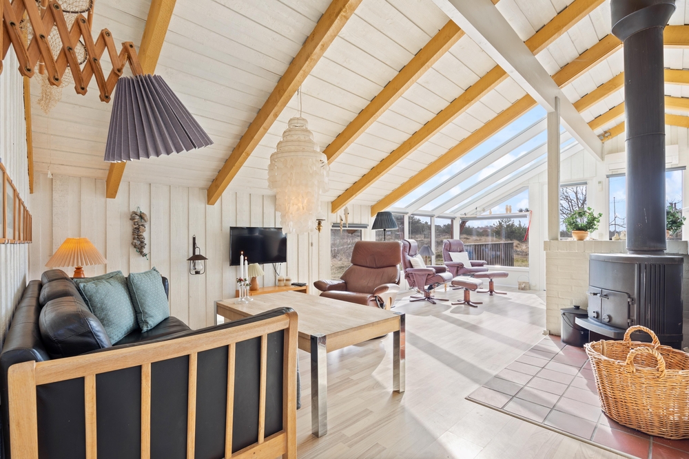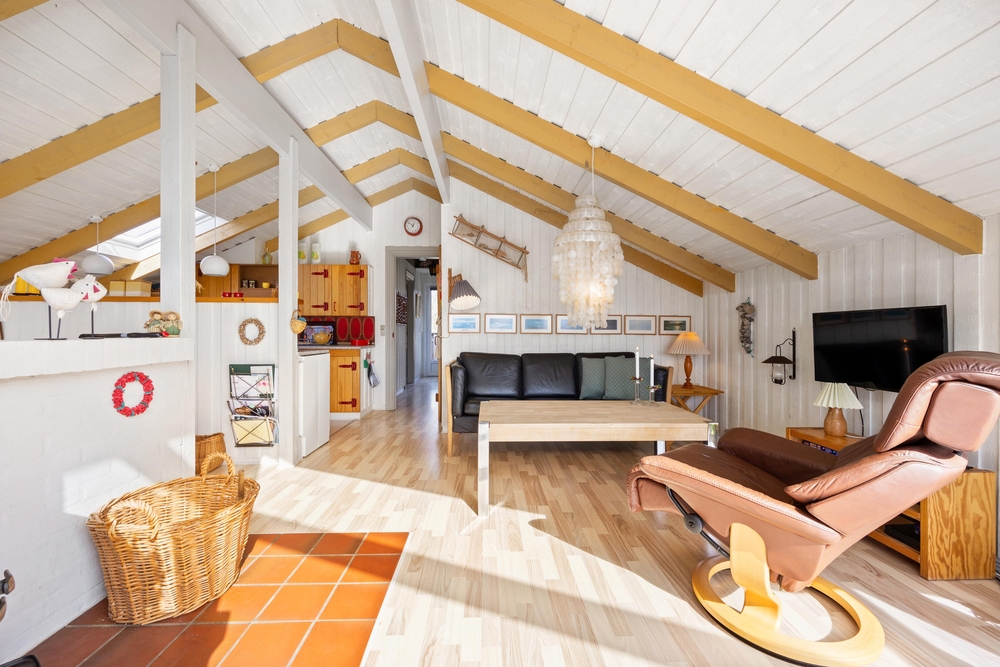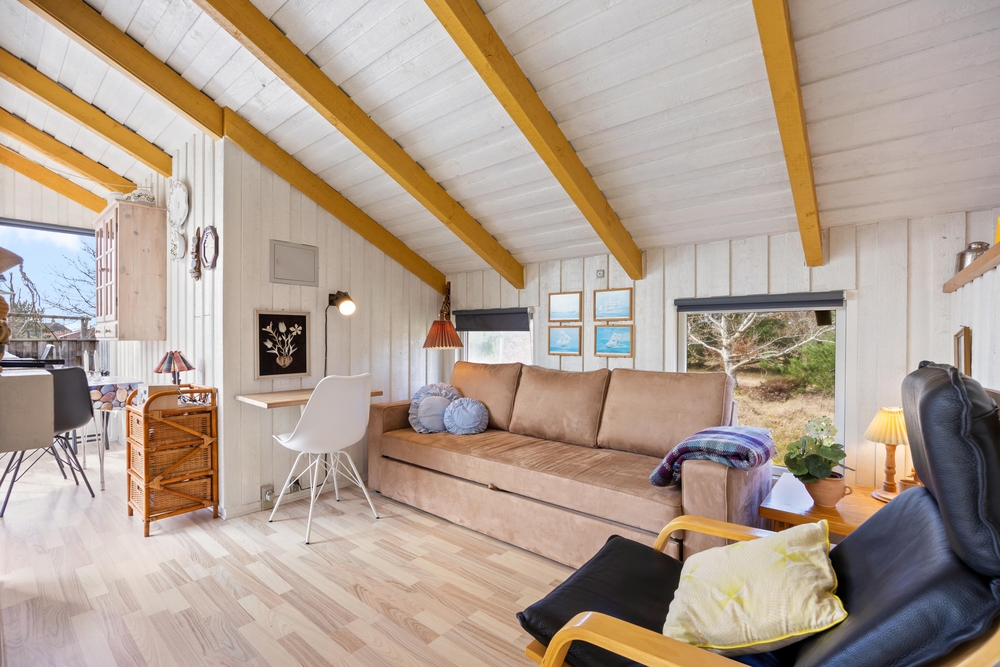 Vom Sofa aus könnt ihr das schöne Licht genießen, welches durch die großen Fenster einfällt. Besonders toll sind die in die Dachschräge eingelassenen Fensterelemente, welche dem gemütlichen Ferienhaus eine ungeahnte Großzügigkeit verleihen.