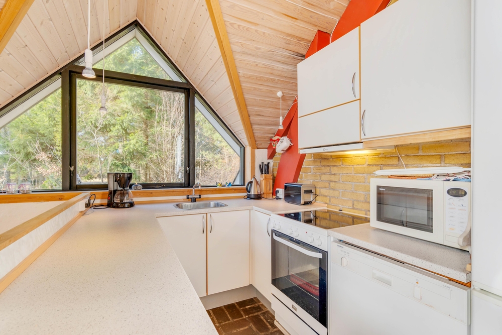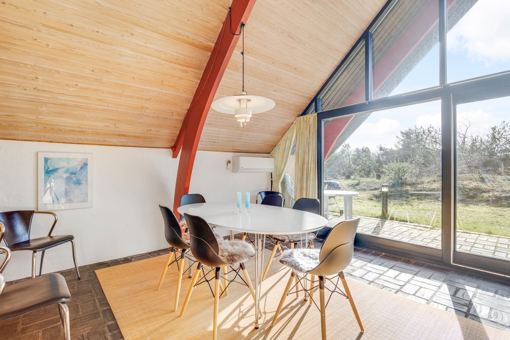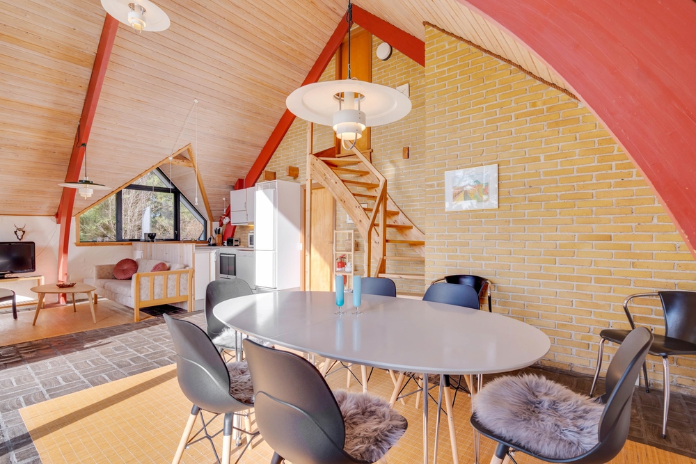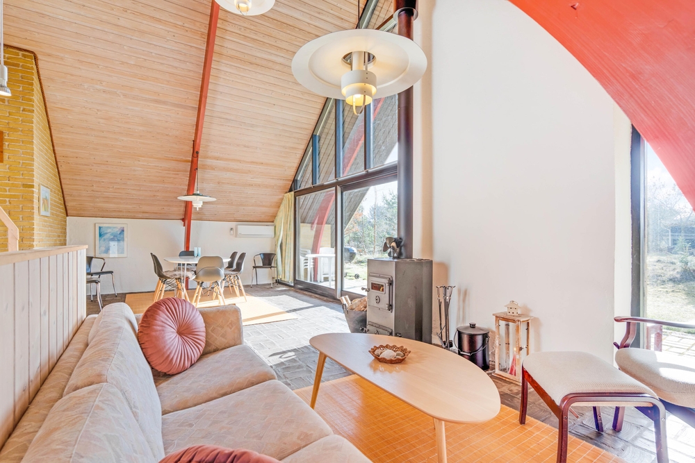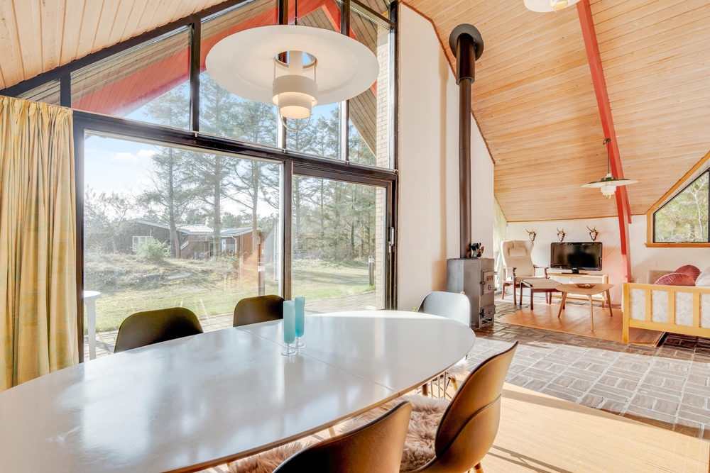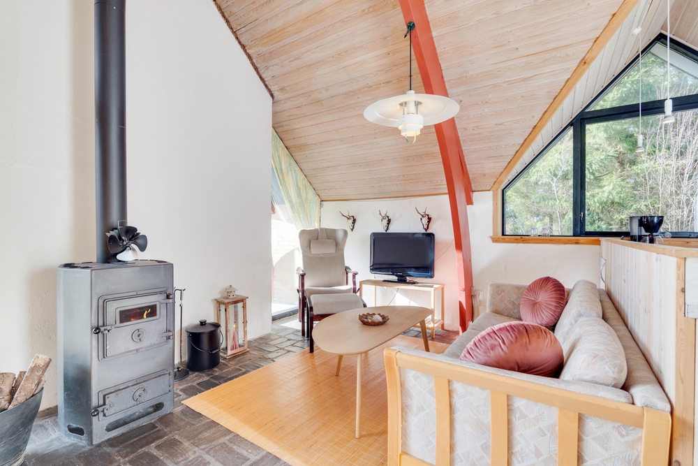 Auf einem idyllischen und von Bäumen und Sträuchern umgebenen Grundstück, in unmittelbarer Nähe zum Angelteich in Lodbjerg Hede, findet ihr dieses ältere Ferienhaus. Platz ist hier für 4 Personen und einen Hund. Das Haus wurde im Nurdach Haus Stil gebaut und mit rustikalem Steinfußboden im Wohnbereich ausgestattet.