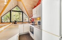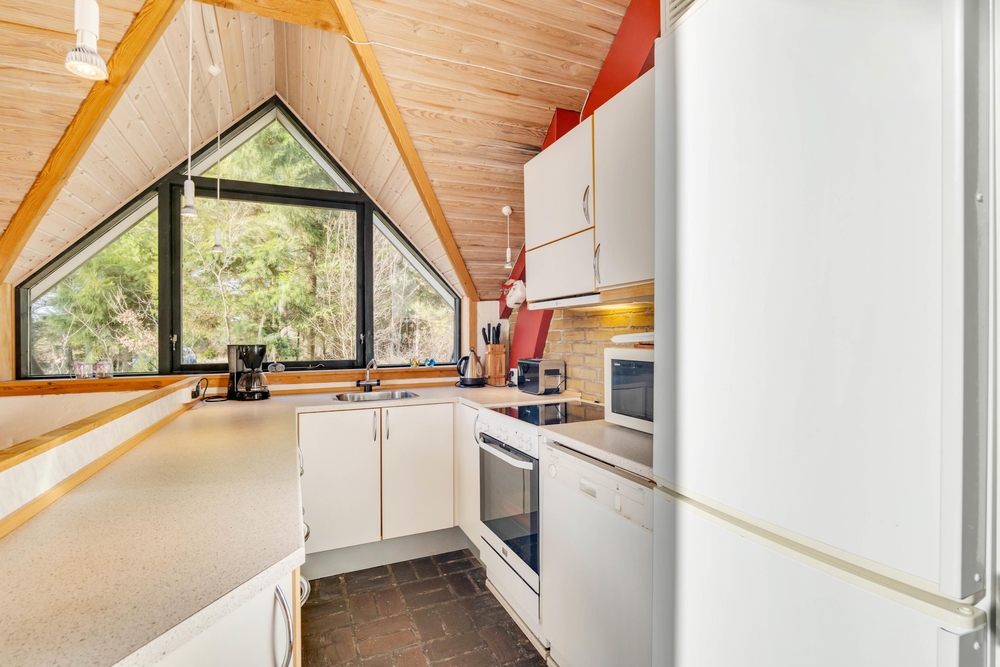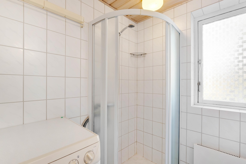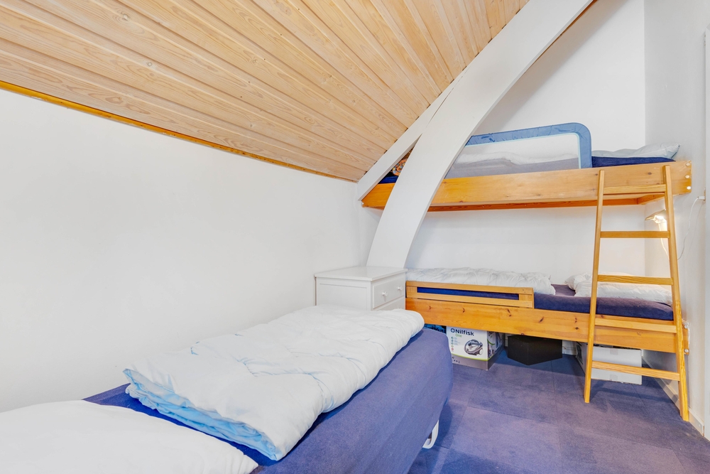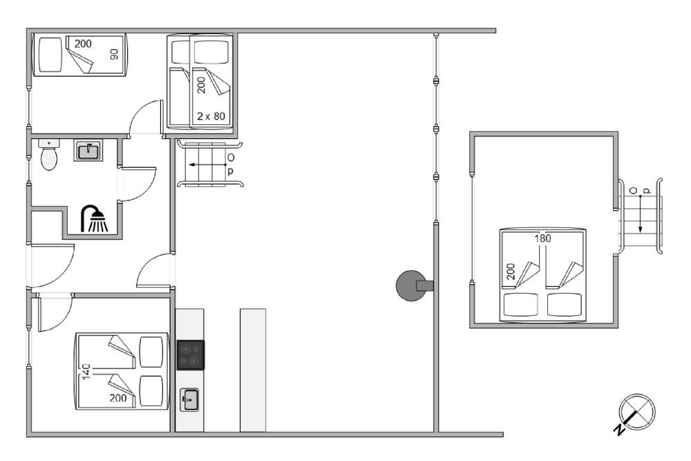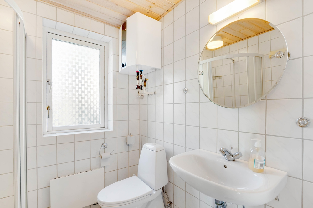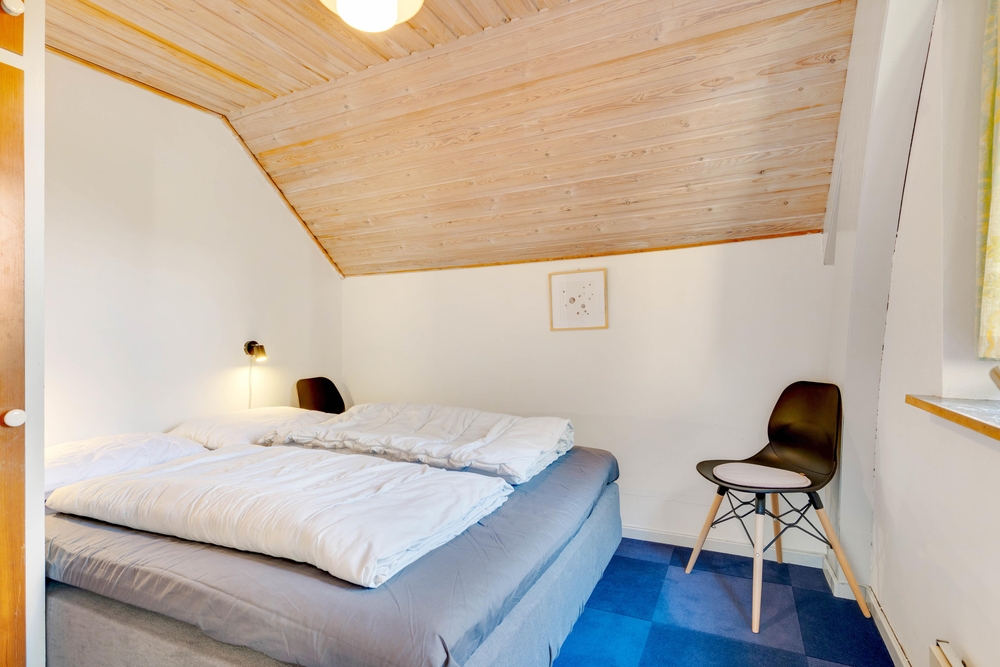 Das Ferienhaus verfügt über 3 Schlafzimmer, wovon eines über eine steile und offene Treppe vom Wohnraum aus zu erreichen ist und zwei weitere Schlafräume im Erdgeschoss. Das kleine und praktische Badezimmer mit einer Fußbodenheizung ausgestattet und kalte Füße am morgen bleiben aus.
