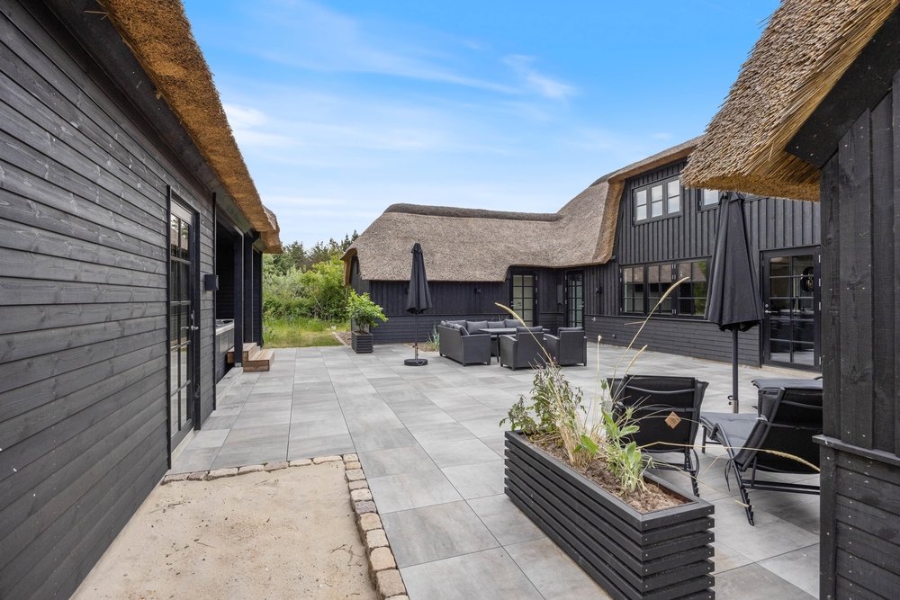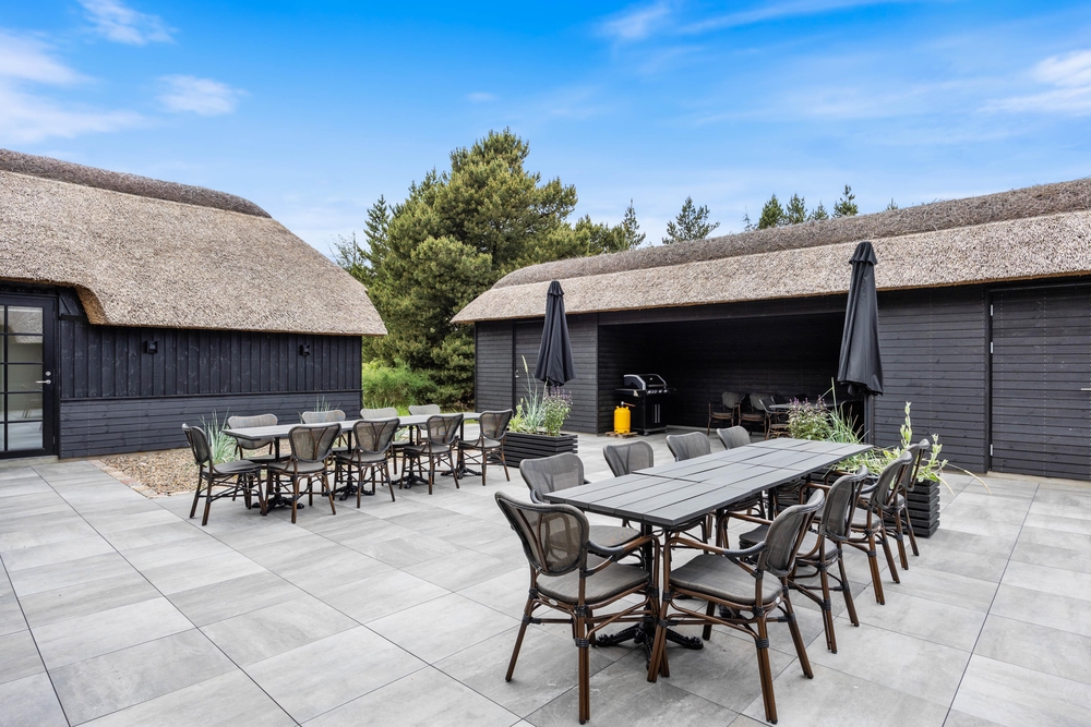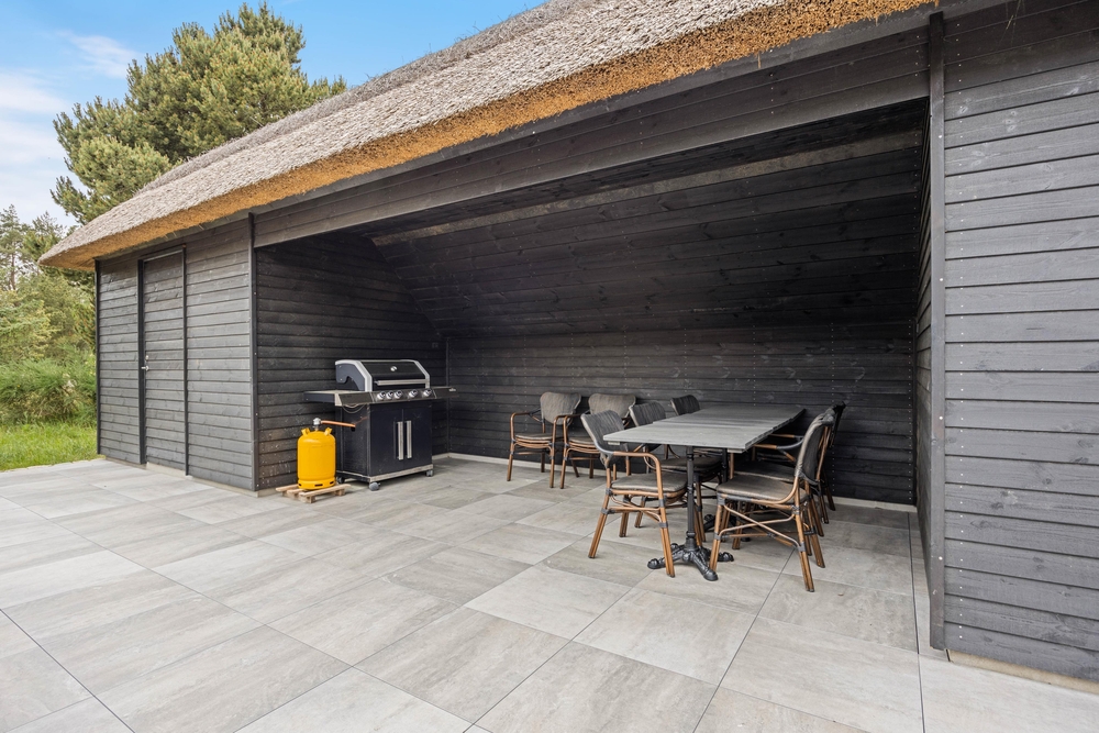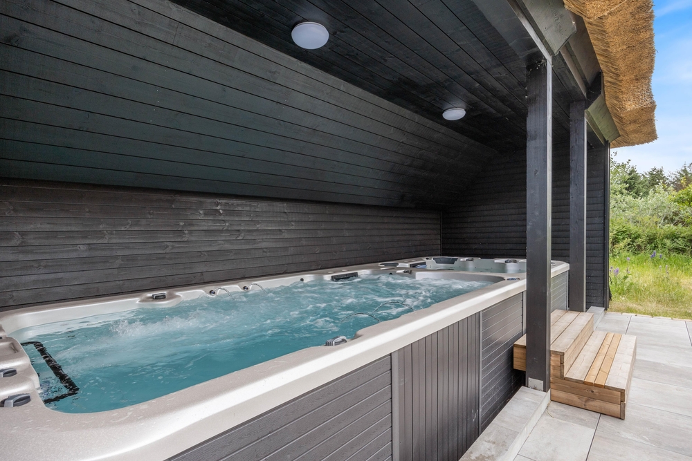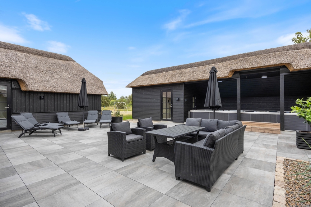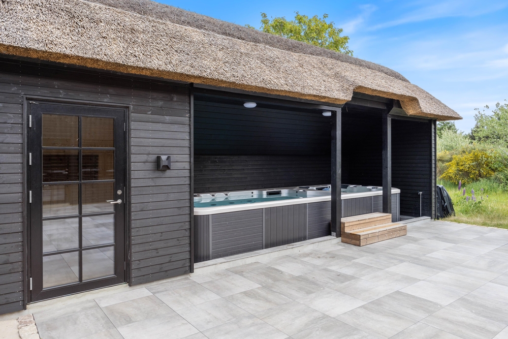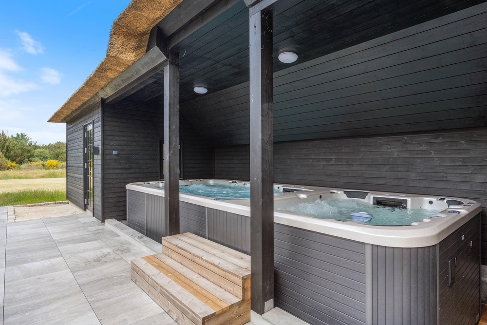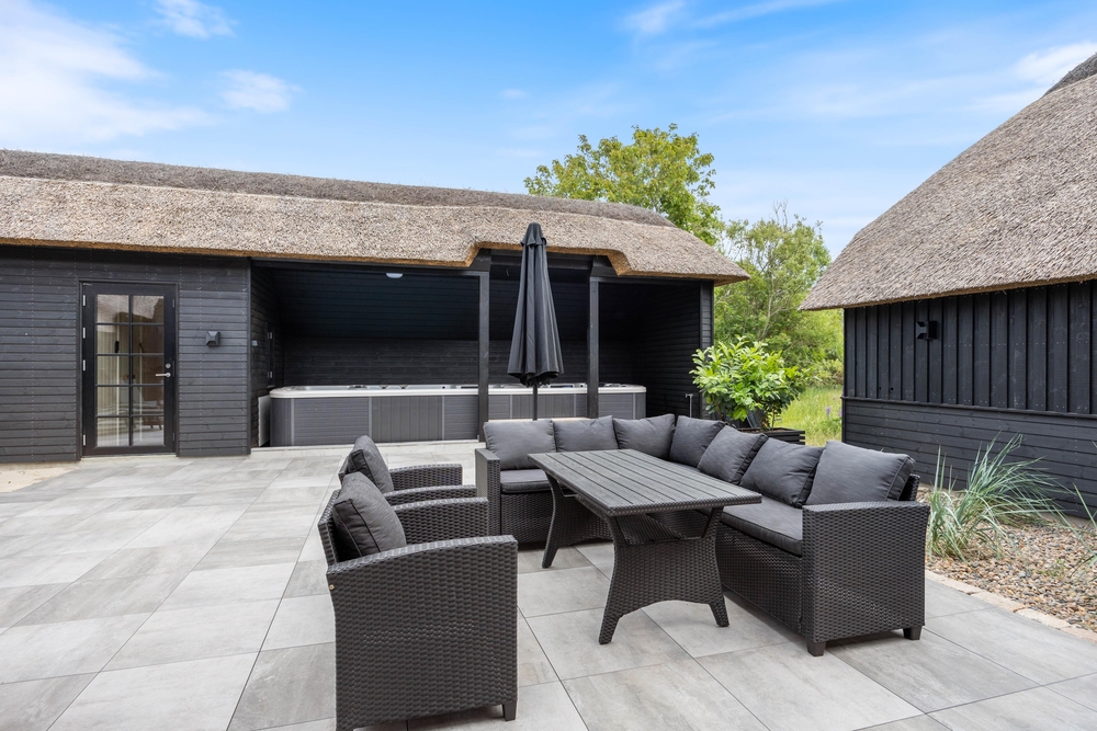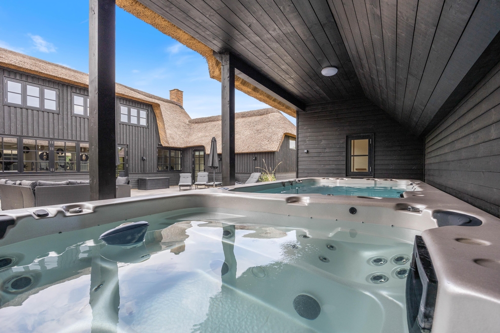 Auch im Außenbereich geht es beeindruckend weiter. Auf den 7100 m2 großem Grundstück lädt euch die wunderschöne, großzügige Terrasse zum Verweilen ein. Leckere Grillabende und jede Menge Spaß im sehr großem Whirlpool Bereich lassen diesen Urlaub unvergesslich werden. Gut geschützt und urgemütlich, ist das wohltuende Sonnenbad auch bei etwas mehr Wind vom Meer möglich und der überdachte Bereich lässt auch ein Verweilen beim Regen zu. Die Außendusche, die von April-November genutzt werden kann, bietet euch die Möglichkeit, nach einem langen Strandspaziergang sich den Sand von den Füßen zu spülen.