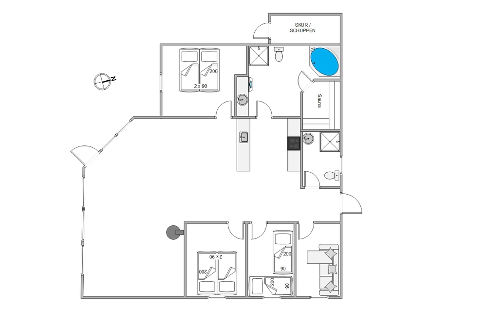 Damit ihr euch gut aufteilen könnt, stehen euch zwei gepflegte Badezimmer zur Verfügung, beide mit Fußbodenheizung und Dusche ausgestattet. Die hauseigene Sauna und der Whirlpool laden zu ruhigen Momenten der Erholung ein, sodass ihr neue Energie tanken könnt. In den vier Schlafzimmern findet ihr zwei Doppelbetten, zwei Einzelbetten und ein Schlafsofa, welche ausreichend Platz für bis zu sechs Personen bieten. Hier könnt ihr euch von aufregenden Urlaubstagen voller Erkundungen und Aktivitäten erholen.