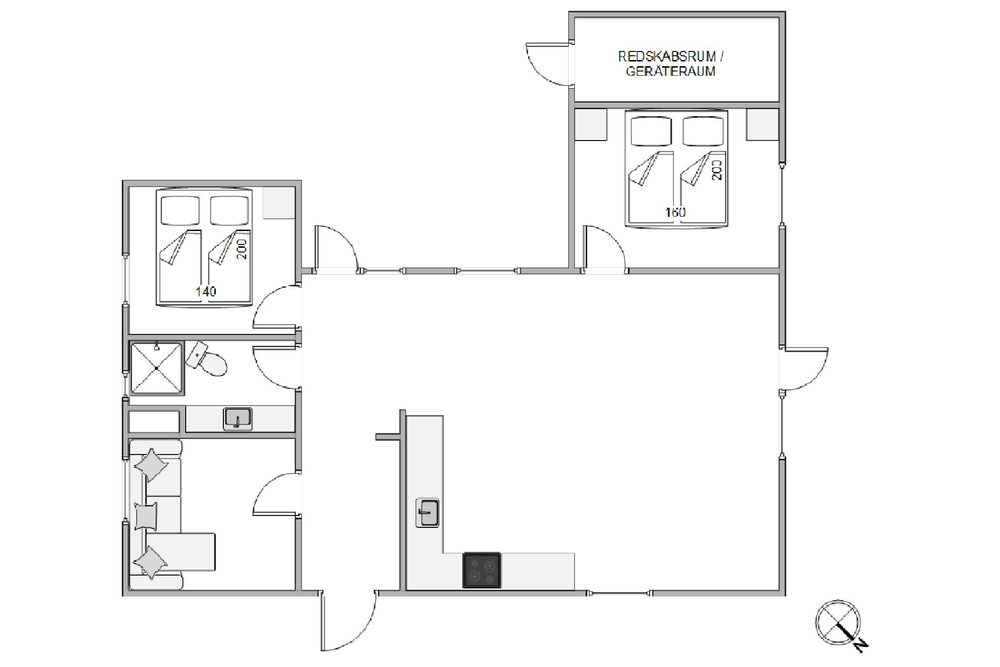 Die drei Schlafzimmer sind mit zwei Doppelbetten und einem Schlafsofa ausgestattet, die eine erholsame Nachtruhe gewährleisten. Das Badezimmer mit Fußbodenheizung sorgt für warme Füße, besonders an kühlen Tagen. Hier könnt ihr entspannen und euch rundum wohlfühlen, während ihr den Stil des klassischen dänischen Ferienhauses genießt.