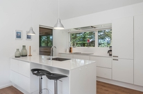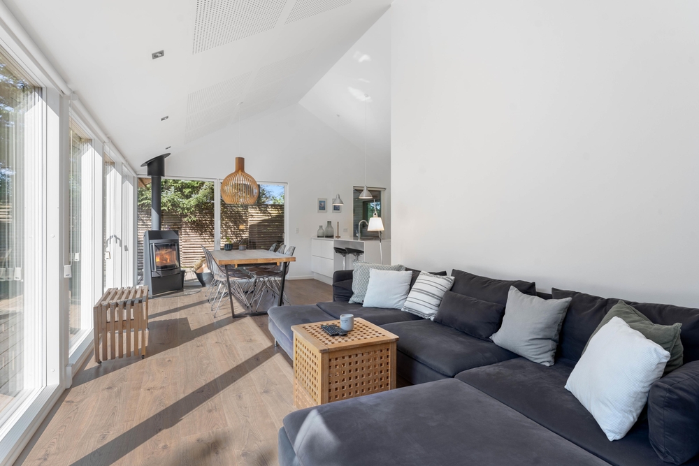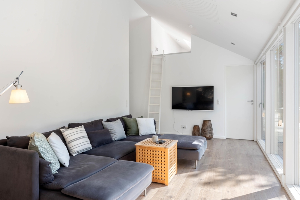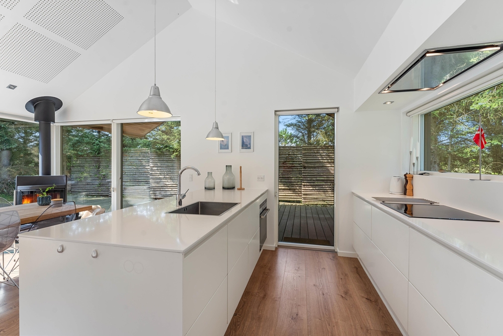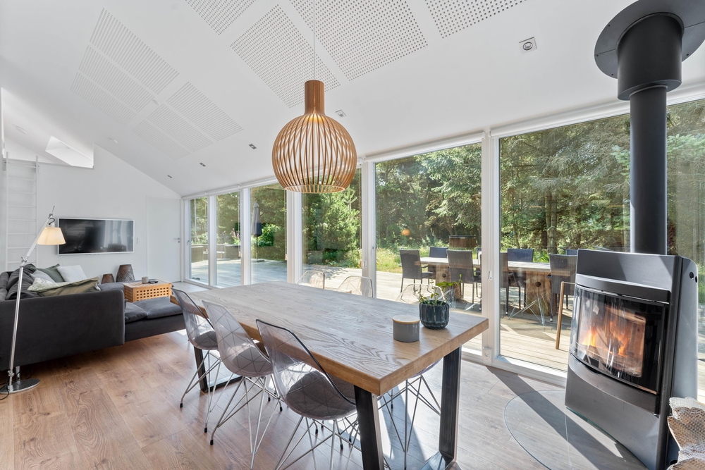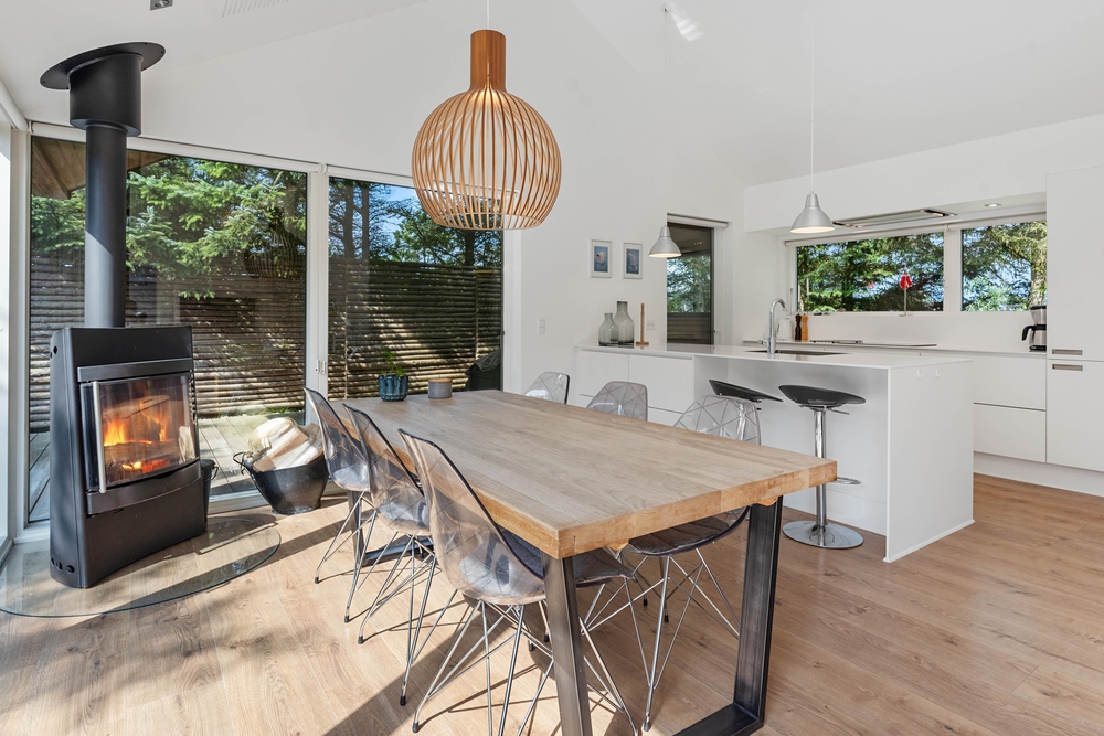 Die ganze Familie kann es sich im westlichen Teil des Ferienhauses gemütlich machen, wo man zusammen kochen, essen und entspannen kann. Für die typische Ferienhausatmosphäre sorgt der Holzofen im Wohnbereich, der durch das Prasseln des Feuers für Gemütlichkeit sorgt. Das Ferienhaus ist außerdem mit einer energieeffizienten Luft-zu-Wasser-Wärmepumpe ausgestattet, die das ganze Jahr über für eine angenehme Wärme über die Fußbodenheizung, die im gesamten Ferienhaus installiert ist, sorgt.