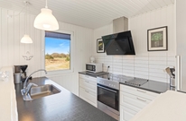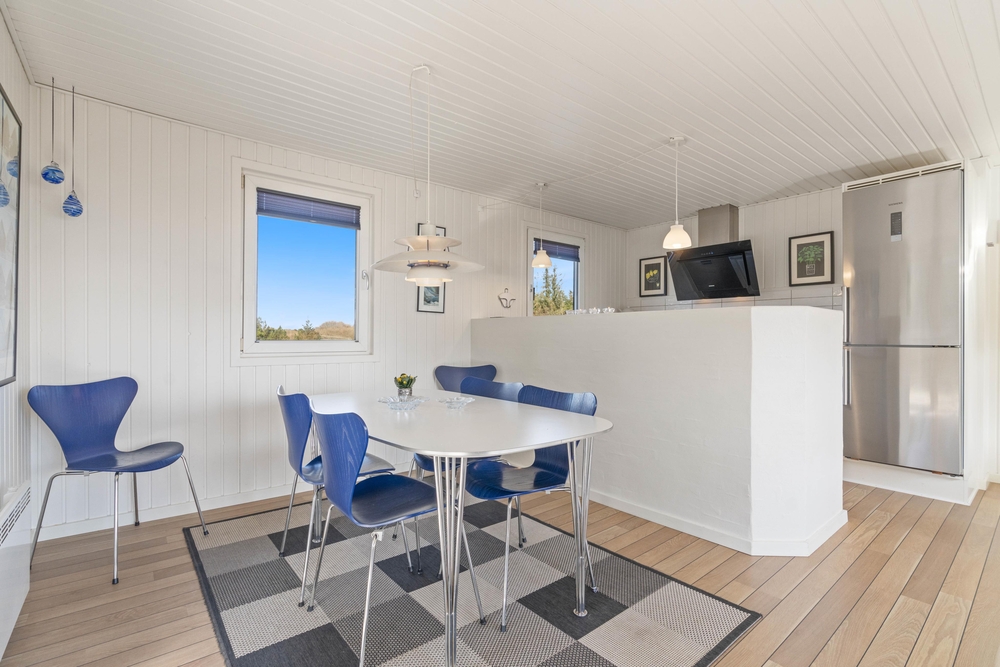 Das Badezimmer hat eine Fußbodenheizung und einen Zugang zur schönen Sauna, wo ihr entspannte Wellnessabende verbringen könnt. Die hübsche Küche ist mit einem Geschirrspüler versehen und offen mit dem Wohn- und Essbereich verbunden. Das Wohnzimmer ist mit bequemen Möbeln eingerichtet und vom Sofa aus könnt ihr sogar die wunderbare Aussicht auf den Ringkøbing Fjord genießen, während ihr euch am prasselnden Kaminfeuer entspannt.