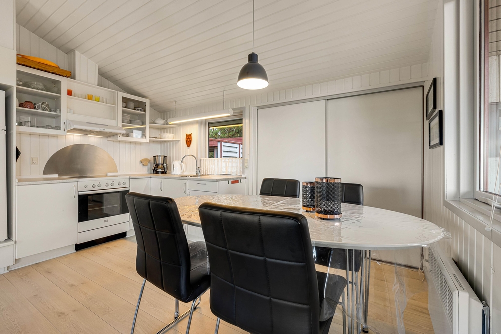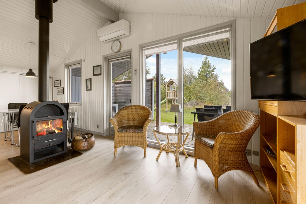 Viel Helligkeit und ein offen gestalteter Wohn-Essbereich erwarten euch hier in Julianehåb 19. Die gemütliche Sitzecke lädt zu Fernsehabenden oder einem guten Buch beim prasselnden Kaminfeuer ein. Von hier aus habt ihr auch einen schönen Blick in Grüne. Durch die Platzierung des Kamins in der Mitte des Raumes, könnt ihr dessen Wärme im ganzen Raum spüren. Zusätzlich könnt ihr noch mit der energiesparenden Wärmepumpe heizen.