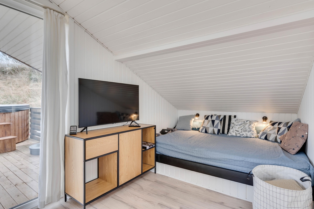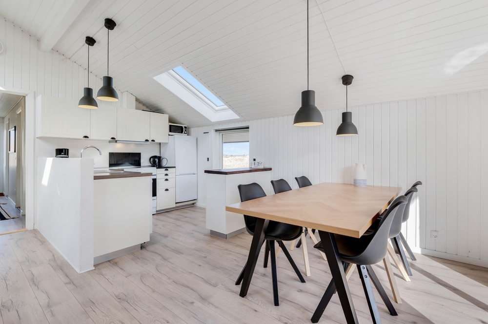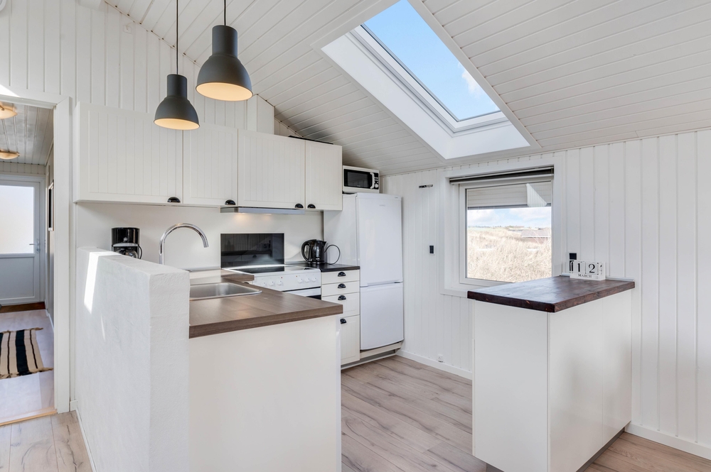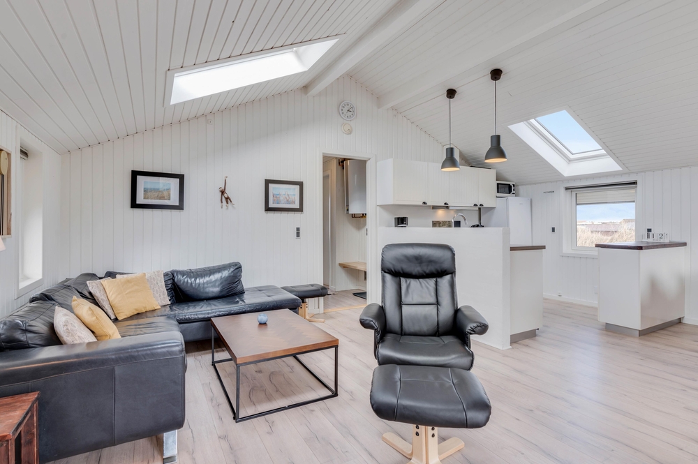 Der Kern eures Ferienhauses besteht aus einem bequemen Wohnbereich und einem gemütlichen Essbereich; beide mit der praktisch ausgestatteten Küche offen verbunden. Die holzverkleideten Wände sowie die firsthohe Decke geben ein angenehmes Gefühl von Geräumigkeit. Und die geschmackvolle Möblierung, zusammen mit dem gemütlichen Alkoven laden euch zum Entspannen in eurem Urlaub ein.