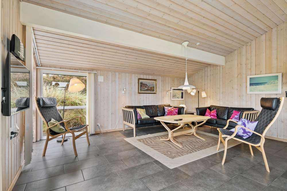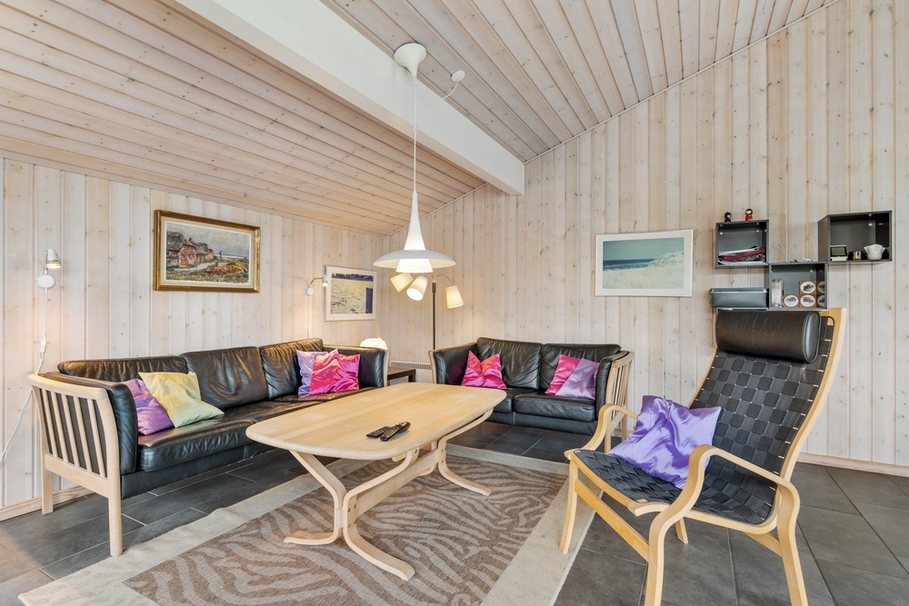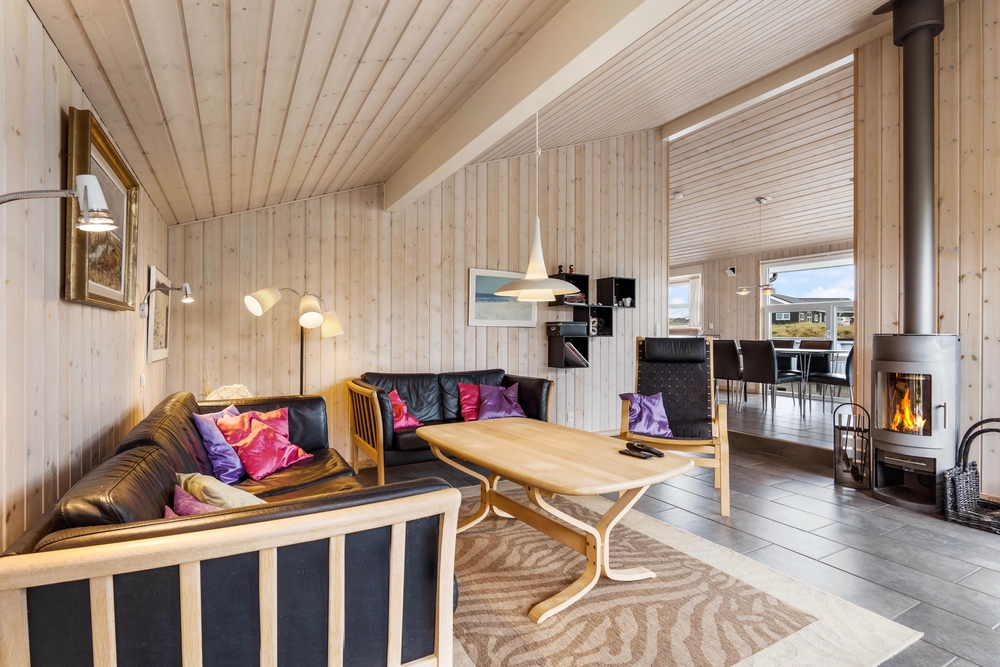 Stilvoll eingerichtet strahlt das Ferienhaus in Bjerregård die typische Urlaubsatmosphäre aus. Im Wohnbereich steht der schöne Kaminofen, der das ganze Jahr über für die angenehme Wärme sorgt. Verteilt auf dem Sofa und den Sesseln kannst du mit allen den Tag Revue passieren lassen und bei einem Glas Wein dem Knistern des Kaminofens lauschen.