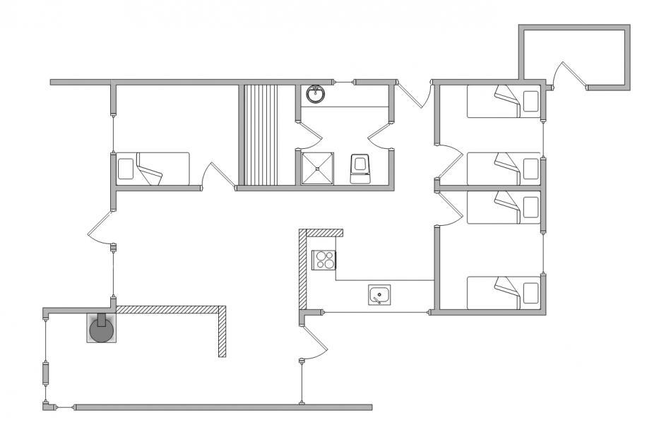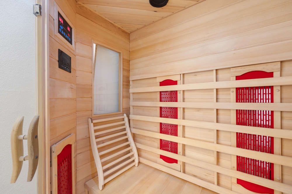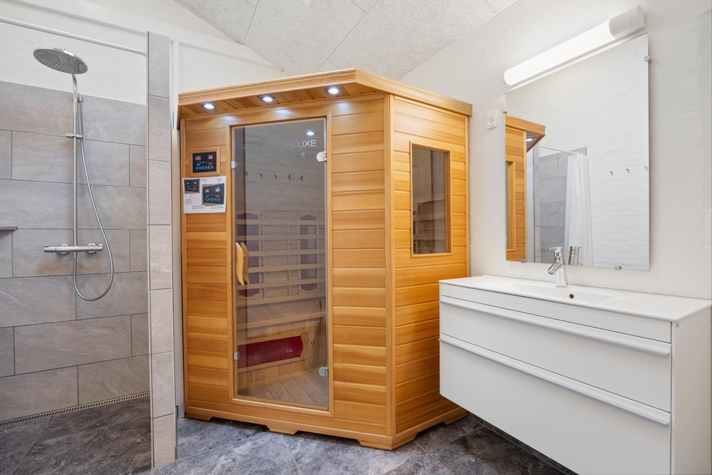 Während ihr euch in der Infrarotsauna entspannt, können die Kinder sich im Aktivitätsraum austoben. Das Badezimmer ist modern gestaltet und bietet neben der Sauna auch Fußbodenheizung und ein Dachfenster für extra Tageslicht.