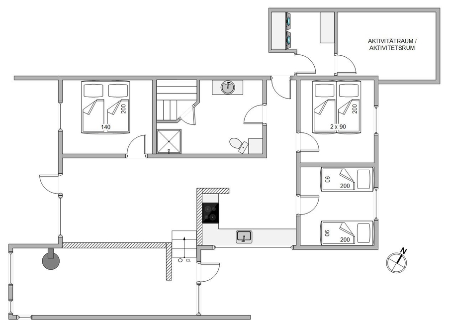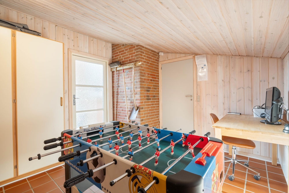 Am Haus findet ihr einen Abstellraum mit einer Waschmaschine und einen Trockner und die Möglichkeit, Angelzeug oder Kaminholz abzustellen. Dieser Raum führt direkt in den Aktivitätsraum mit Tischfußballspiel und Dart, sowie einer Playstation 4.
