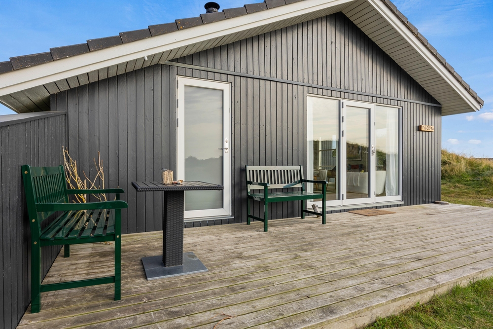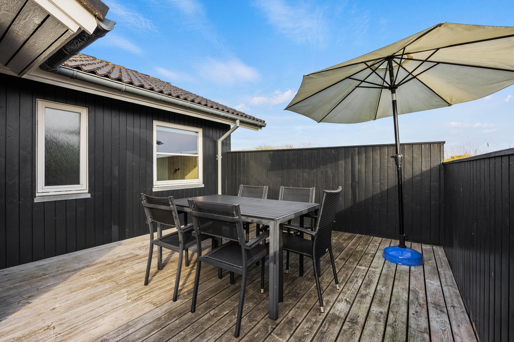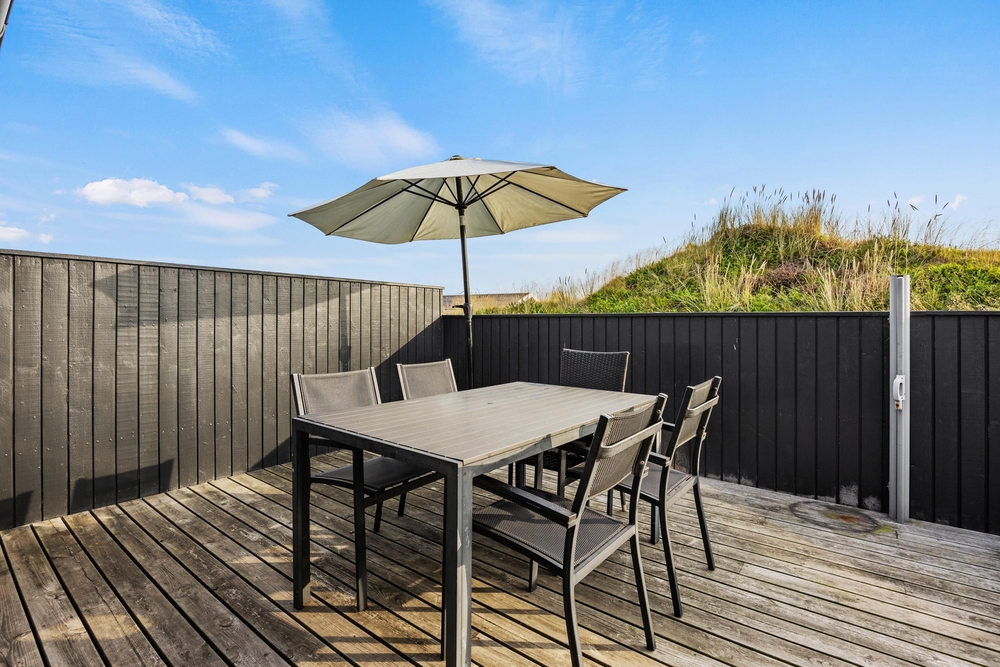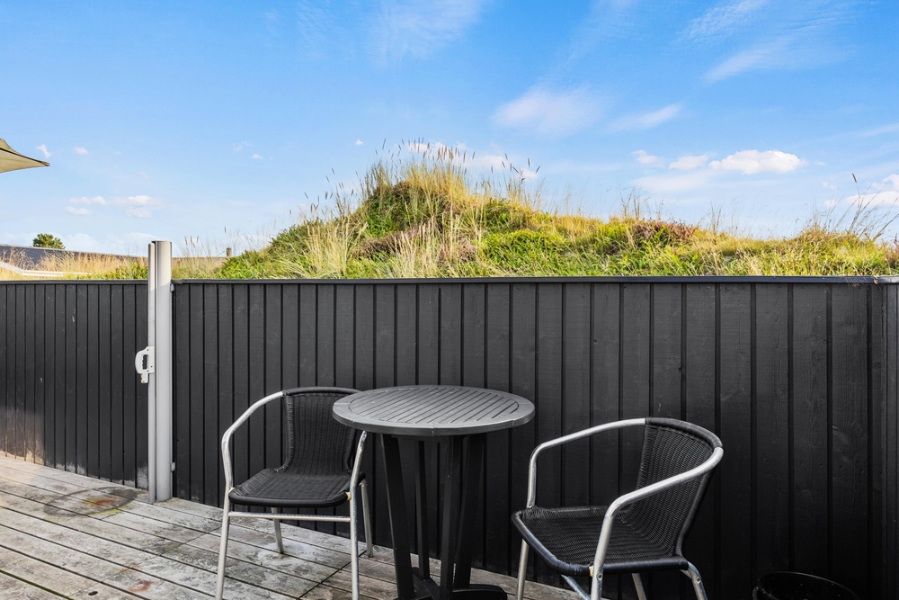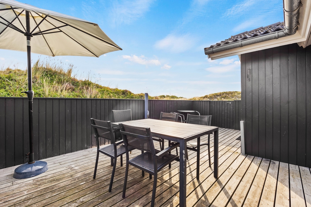 Um die frische Meeresluft zu genießen habt ihr am Haus zwei Terrassen. Eine offene Terrasse und eine geschützte, auf der ihr euch in den Liegestühlen zurücklehnen und entspannen könnt. Genießt den herrlichen Weitblick über die schöne Dünen- und Heidelandschaft. Auf dem Gasgrill könnt ihr den Abendstunden eure Liebsten mit einem leckeren Steak verwöhnen.
