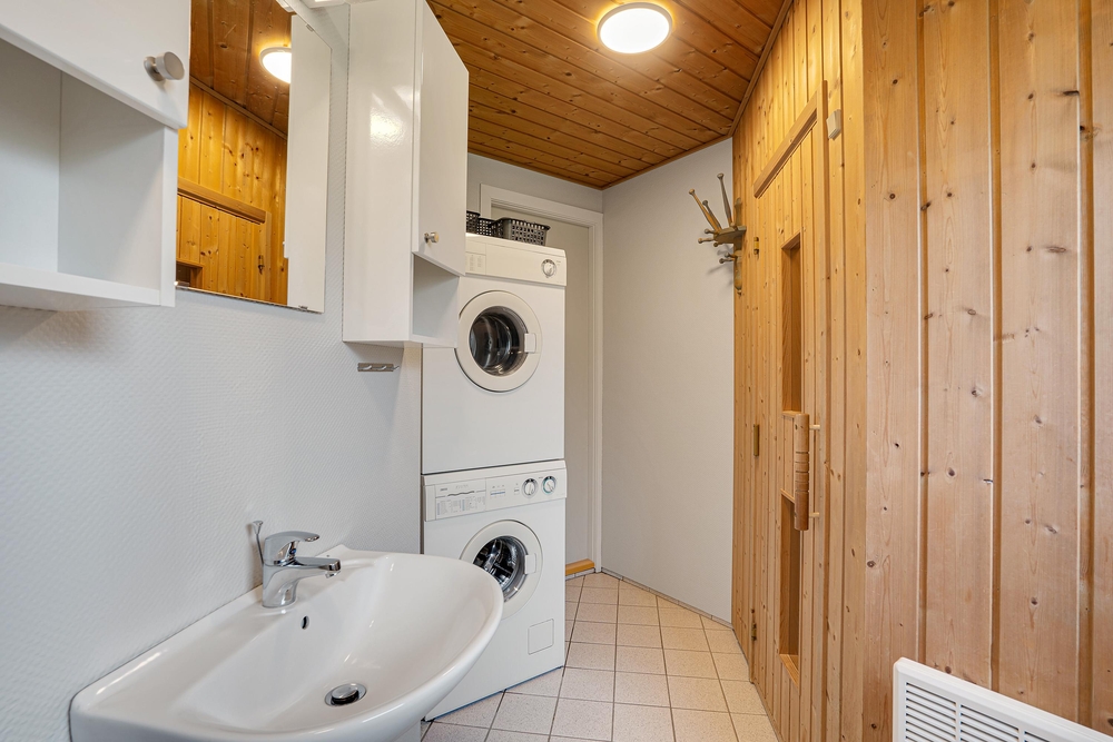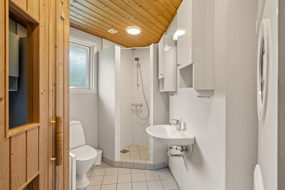 Das Ferienhaus verfügt des Weiteren über ein Badezimmer mit Fußbodenheizung und Sauna. Die Sauna ist ein guter Ort der Entspannung und nach einem langen und vielleicht sogar etwas stürmischen Tag am Meer ist es sehr wohltuend, hier wieder etwas Wärme und Energie zu tanken.