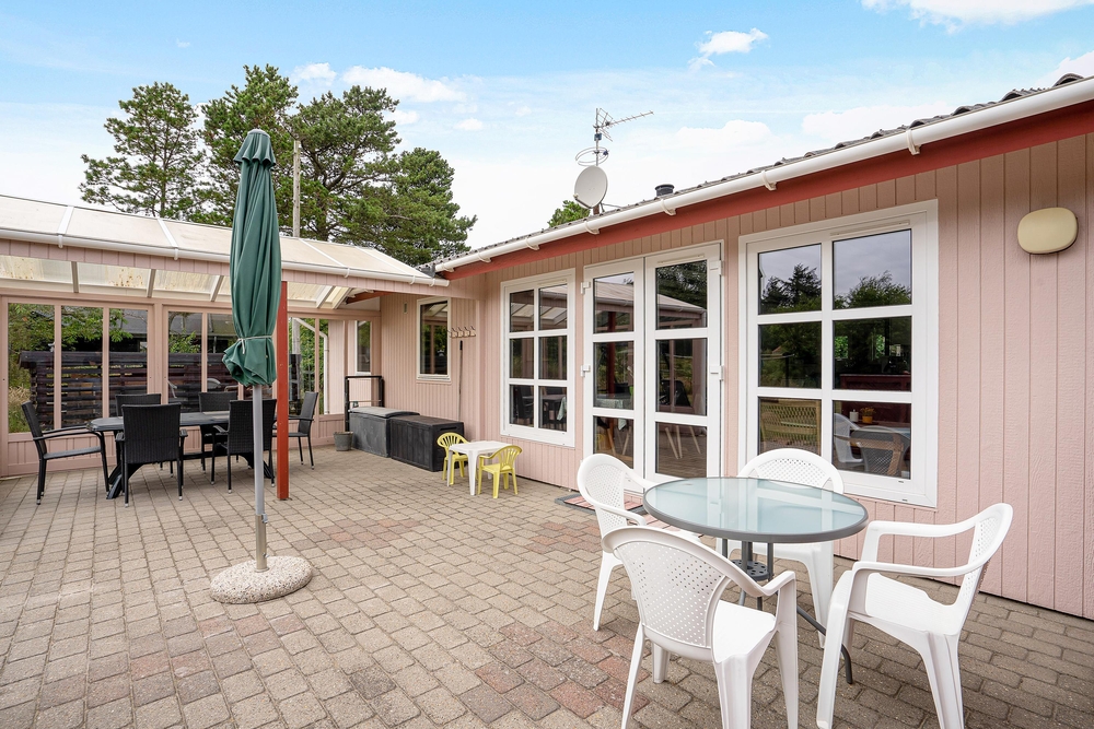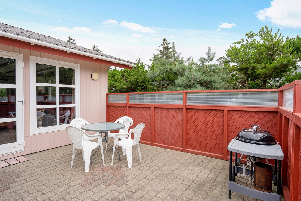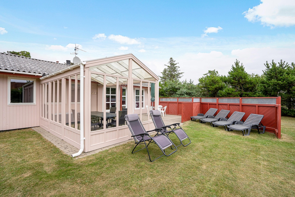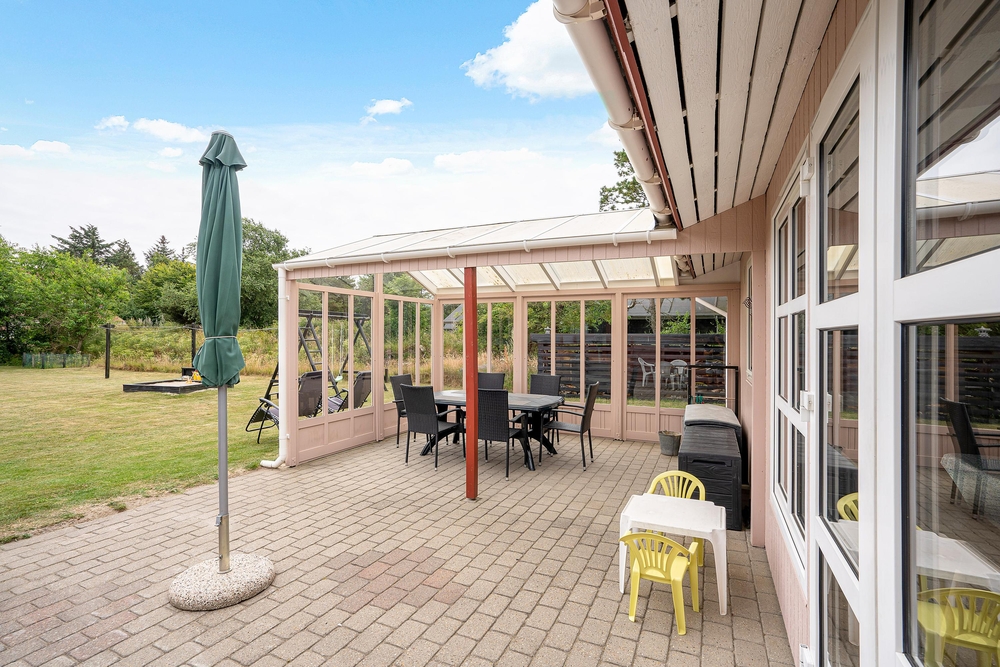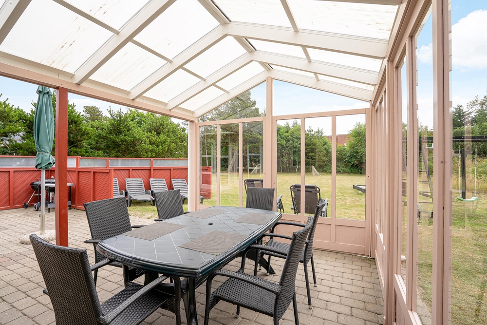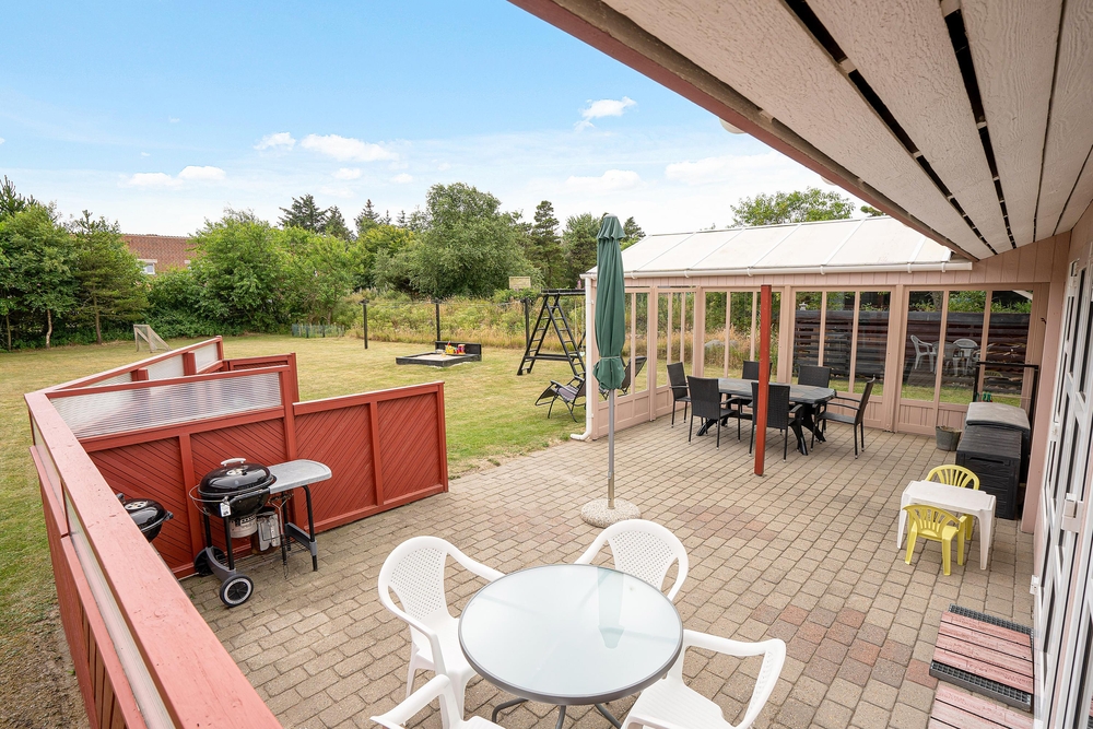 Um das Haus herum sind Terrassen, die je nach Wetterlage und Tageszeit genutzt werden können. Die offene als auch die überdachte, verglaste Terrasse sind eingezäunt und hier befinden sich Terrassenmöbel, Liegestühle und ein Grill. Von hier aus könnt ihr euren Kindern auf dem Rasen, abgeschirmt von Bäumen und Büschen, beim Spielen auf der Schaukel, Sandkasten oder im Spielhaus zusehen. An einem schönen Sommerabend könnt ihr hier nach dem Grillen noch lange sitzen und den Sonneuntergang geniessen.
