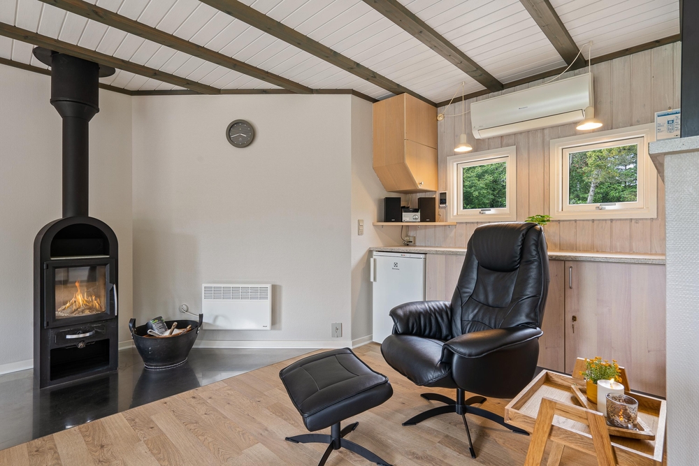 Der Wohnbereich verfügt über einen Kaminofen und gemütliche Sitzgelegenheiten, wo ihr einfach einmal die Beine hochlegen und es euch gemütlich machen könnt. Gerade am Abend ist es doch so richtig gemütlich, wenn alle beieinander sitzen, die Erlebnisse des Tages Revue passieren lassen und dabei im Hintergrund dem Knistern und Knacken des Feuers zu lauschen. Eine Wärmepumpe sorgt für behagliches Klima und Wärme auf energiebesparende Weise.