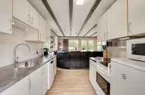 Die Küche mit Geschirrspüler ist offen zum Wohnbereich hin und der Essbereich hat eine grosse Fensterparti mit Aussicht ins Grüne. Hier mag man sich gerne zum Essen aufhalten und vielleicht zusammen den nächsten Tag planen.