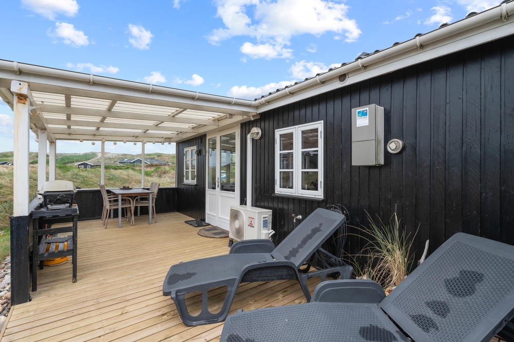 Das Ferienhaus besitzt eine gemütliche Terrasse, die nach Osten ausgerichtet und teilweise überdacht, abgeschirmt und teilweise geschlossen ist. Deshalb kann man die Terrasse den ganzen Tag über nutzten und dies ganz besonders Abends für gemütliche Grillabende mit dem Rauschen der Nordsee im Hintergrund genießen.