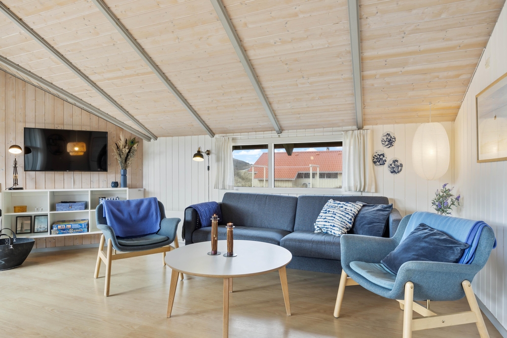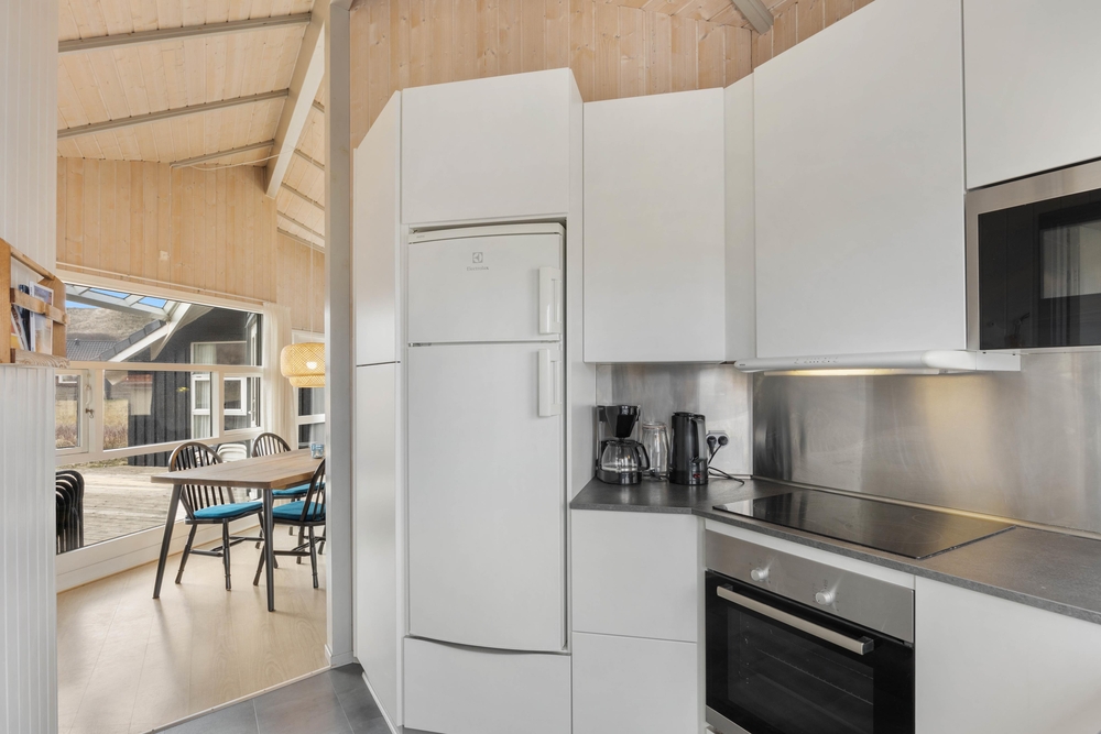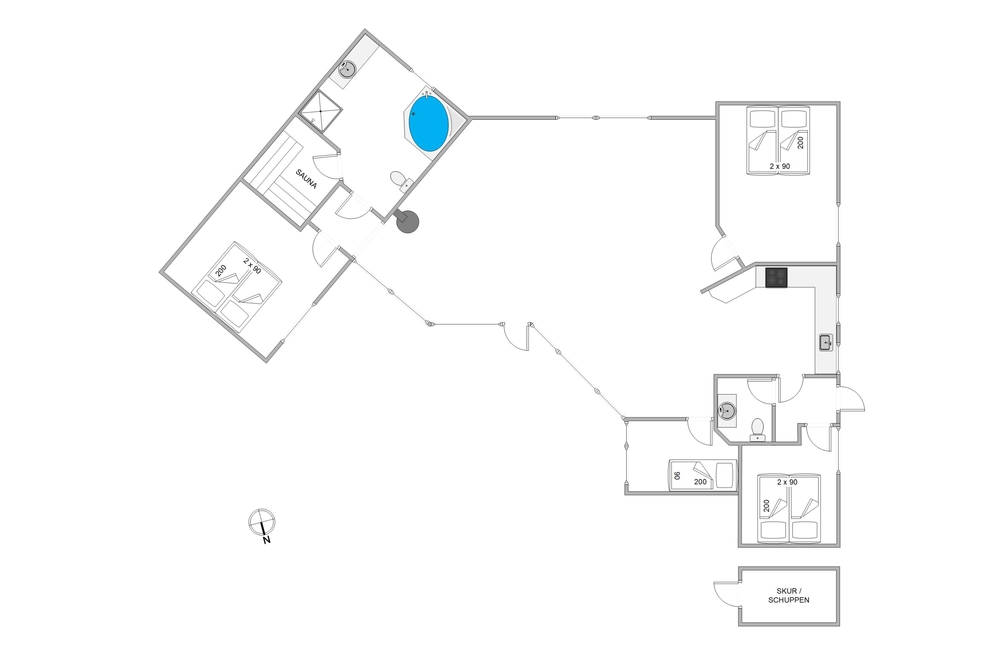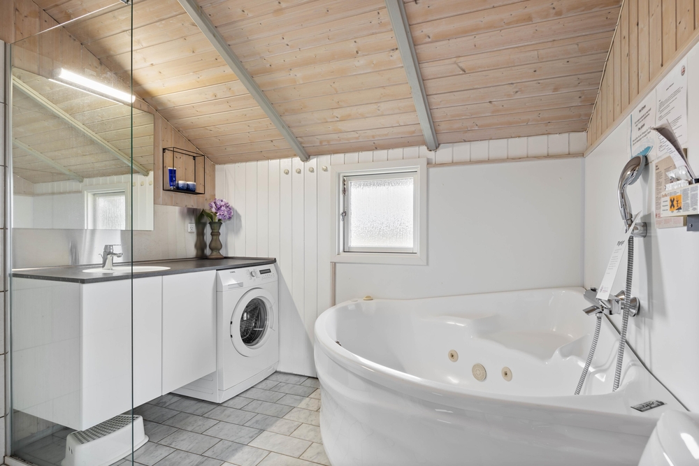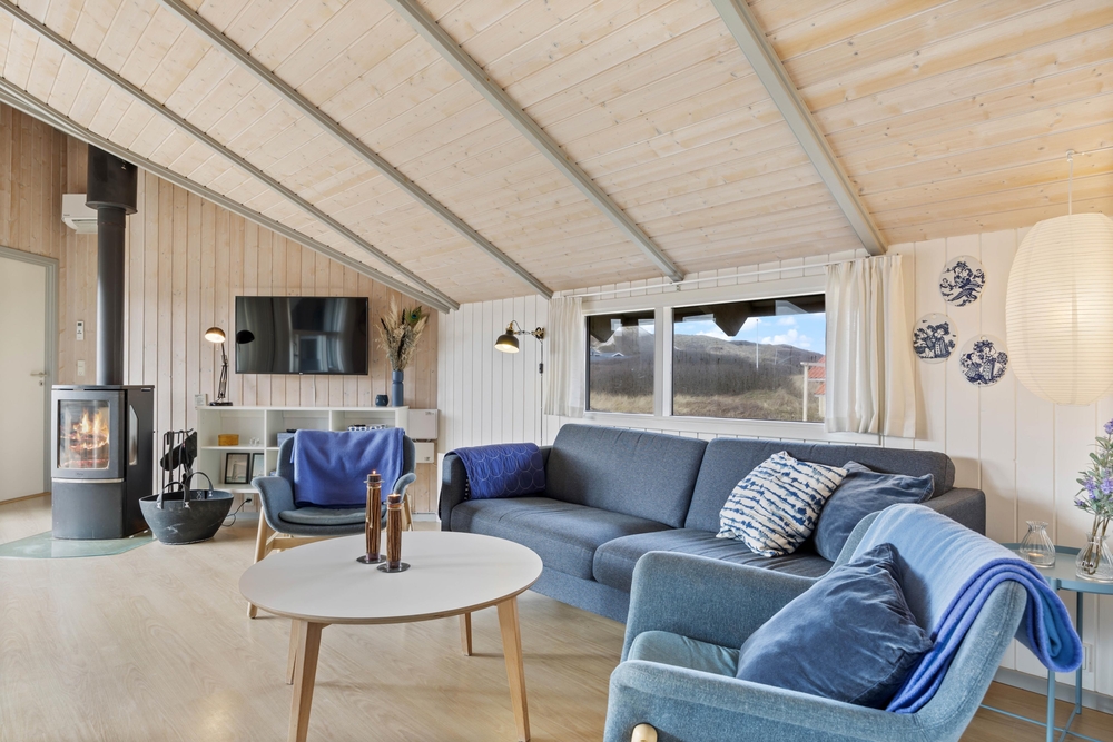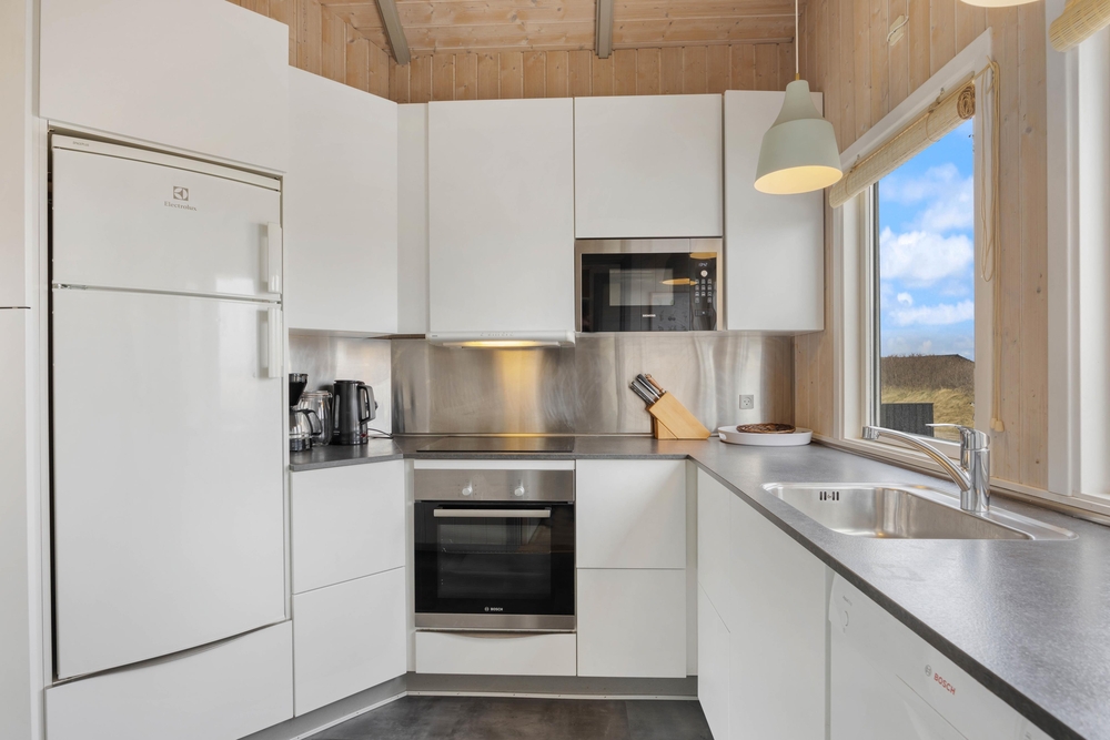 Die große Fensterpartie in diesem Ferienhaus sorgt für einen guten Lichteinfall in den großen Wohnraum. Hier könnt ihr z.B. beim gemeinsamen Kochen viel Zeit miteinander verbringen und es euch anschließend gemütlich machen, während im Hintegrund die Flammen im Kamin knistern. Zusätzlich zu der wohligen Wärme, die der Kamin verströmt, könnt ihr das Ferienhaus mit der energiesparenden Luft-zu-Luft-Wärmepumpe heizen. Das Ferienhaus hat insgesamt 4 Schlafzimmer auf die ihr euch verteilen könnt, um eure Batterien nach einem langen Tag wieder aufzuladen. Drei der Schlafzimmer sind jeweils mit einem 160x200cm großen Doppelbett ausgestattet, während das vierte Schlafzimmer über zwei Einzelbetten verfügt. Das Badezimmer ist mit einer Fußbodenheizung ausgestattet, sodass ihr an kalten Tagen morgens keine kalten Füße bekommt. Damit es morgens zu keinem Stau vor dem Badezimmer kommt, wurde das Ferienhaus mit einer zusätzlichen Gästetoilette ausgestattet. Nach einem langen Tag am Strand werdet ihr euch sicher über den Whirlpool und die hauseigene Sauna freuen, in der ihr euch zurücklehnen,entspannen und wieder aufwärmen könnt.