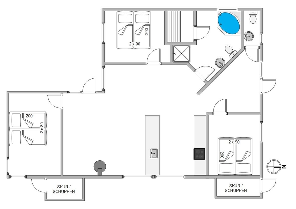 Das Haus wirkt hell und einladend, ist gut eingerichtet; Küche und Wohnzimmer sind offen kombiniert. Die Küche verfügt über alle gängigen Geräte. Das Badezimmer bietet Whirlpool und Sauna und die 3 Schlafzimmer sind alle mit Federkernmatratzen ausgestattet. Ferner steht drahtloses Internet zur freien Verfügung, damit Ihr den Kontakt zur Außenwelt während eueres Urlaubs nicht verliert.
