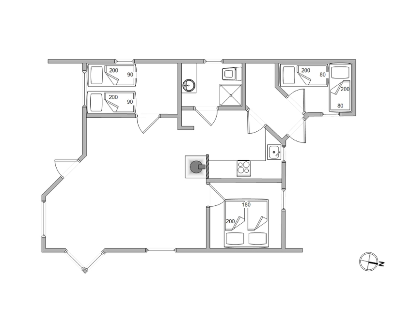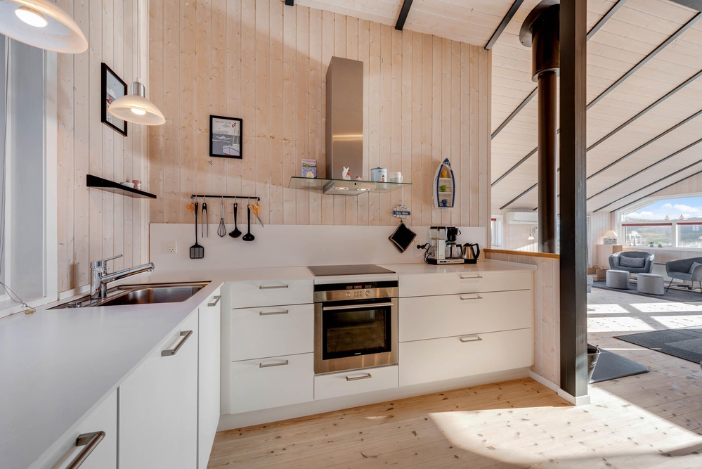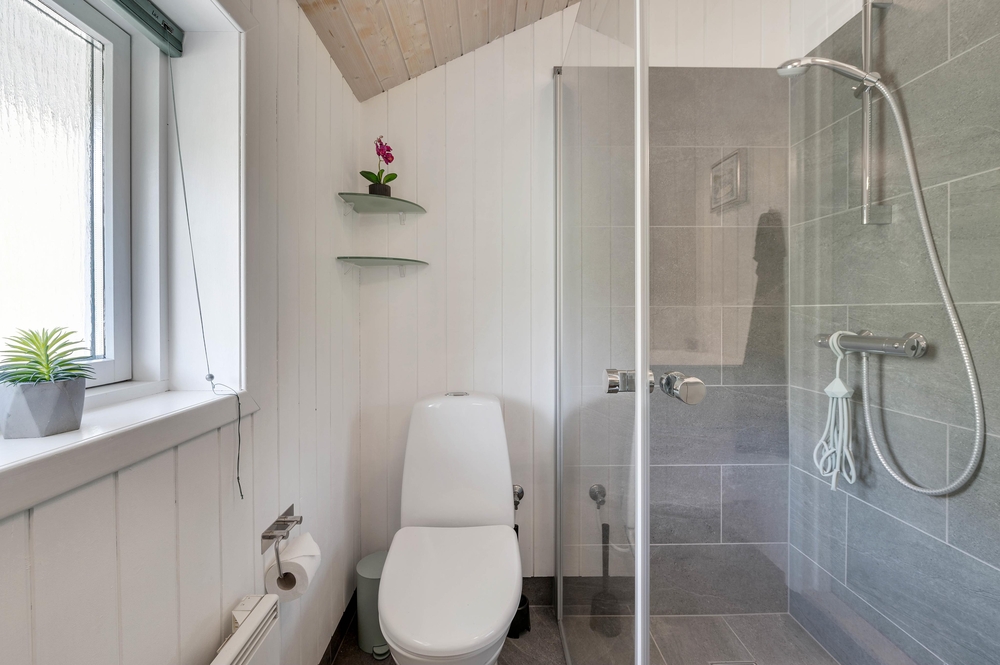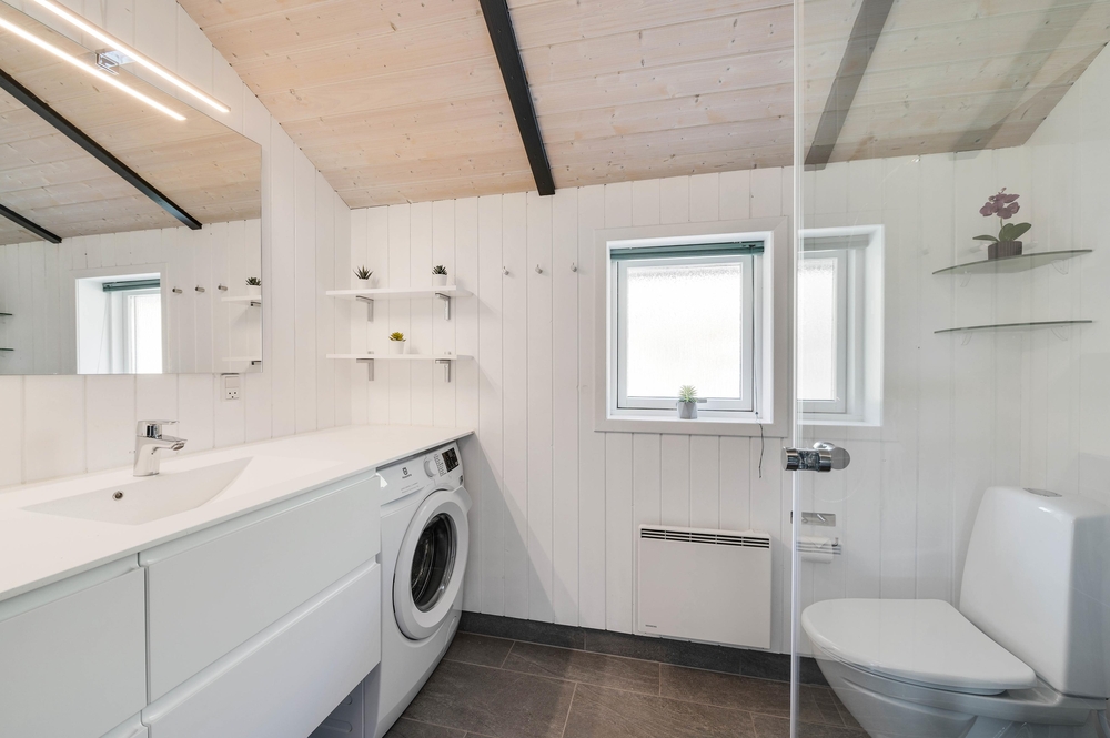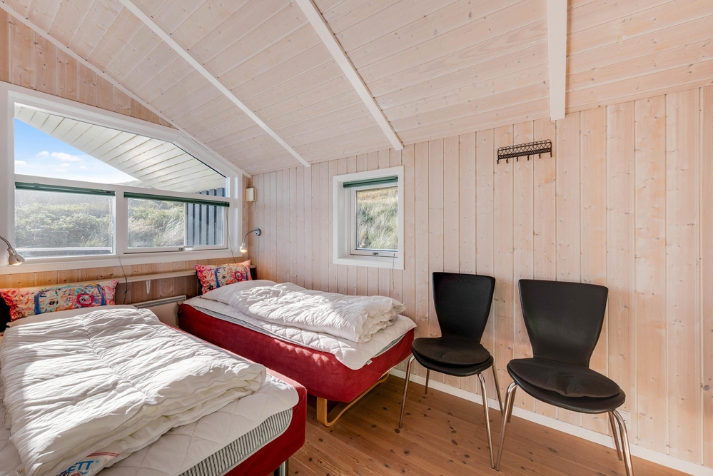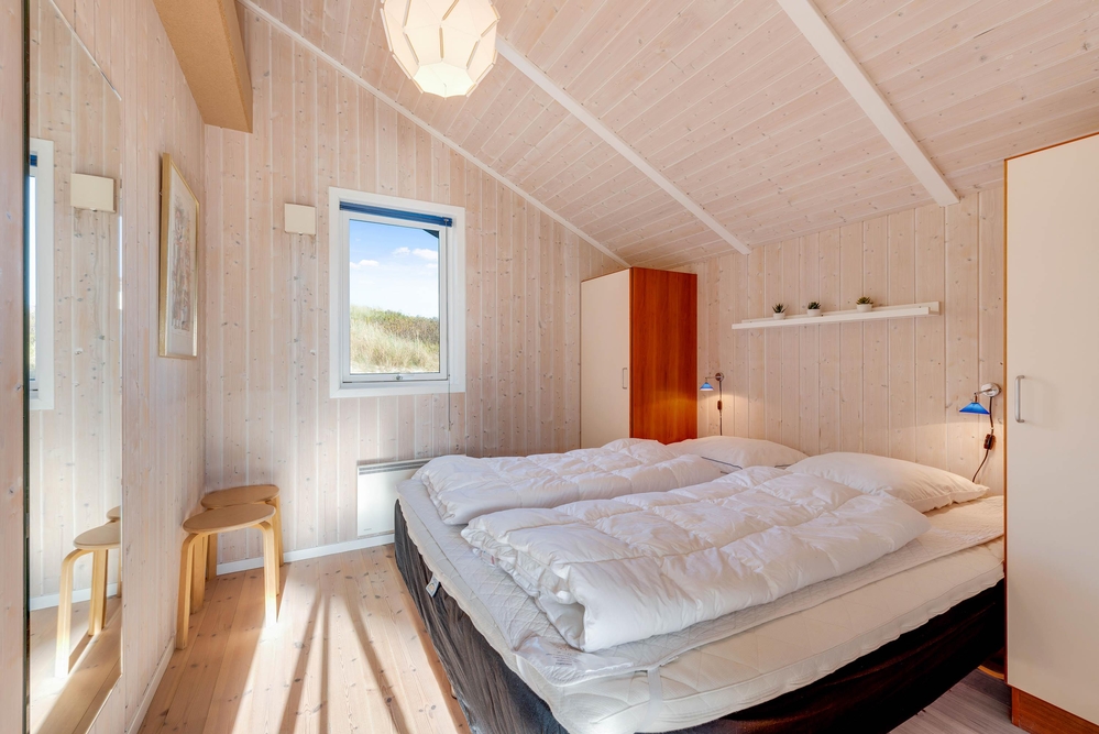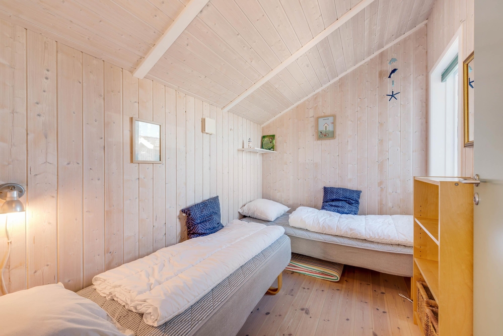 Es gibt überall im gemütlichen Ferienhaus helle Holzfußböden, helle Wände und firsthohe Decken. Zwei von den drei Schlafzimmern sind mit 2 Einzellbetten eingerichtet und im dritten steht ein Doppelbett für eine erholsame Nachtruhe bereit. Das Badezimmer bietet eine Duschkabine, eine angenehme Fußbodenheizung und eine praktische Waschmaschine.