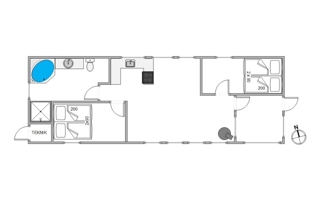 Nur ca. 3 km vom Ferienhaus entfernt liegt der breite Sandstrand, und nur 1 km entfernt befindet sich das Sea West Center mit Badeland und Aktivitäten für Kinder und Erwachsene. Einkaufsmöglichkeiten befinden sich in der Nähe, ca. 4 km entfernt.