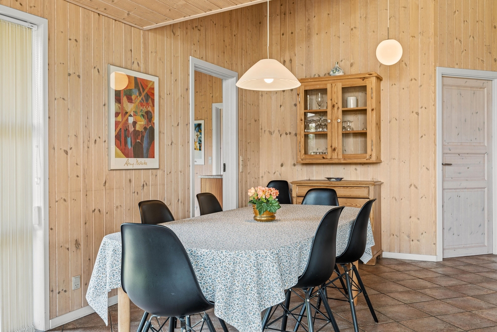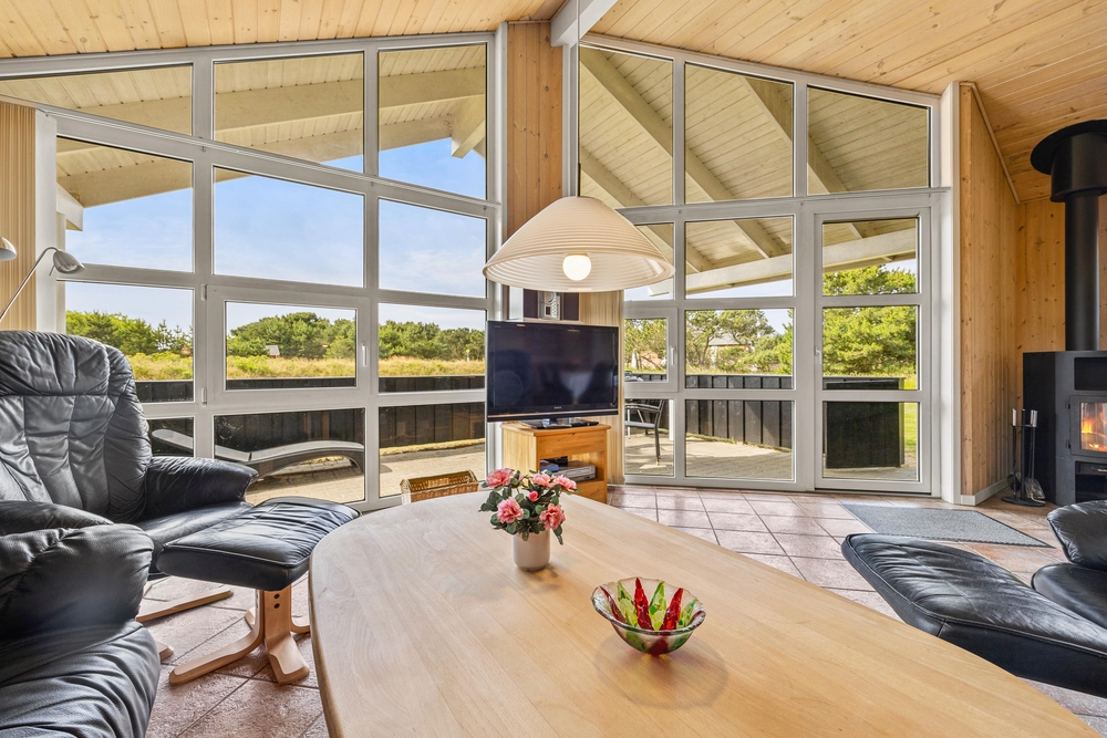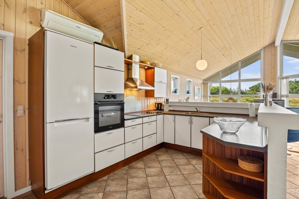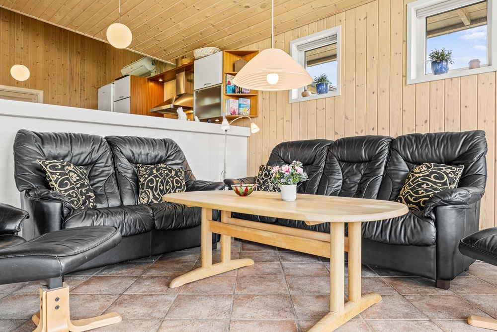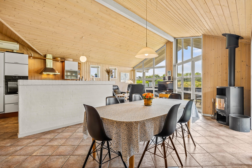 Die klassische Inneneinrichtung zieht sich wie ein roter Faden durch das Ferienhaus, das Gemütlichkeit und klassischen Ferienhausstil ausstrahlt. Von der gut ausgestatteten offenen Küche mit Geschirrspüler und separatem 60-Liter-Gefrierschrank könnt ihr das Geschehen im Wohnzimmer verfolgen, wo die bequemen Möbel zu gemütlichen Abenden mit einem guten Film vor dem Fernseher einladen, während der Holzofen für eine angenehme Atmosphäre und Wärme sorgt. Neben dem Holzofen verfügt das Ferienhaus auch über eine Wärmepumpe, die eine energiesparende und effiziente Beheizung des Ferienhauses gewährt.
