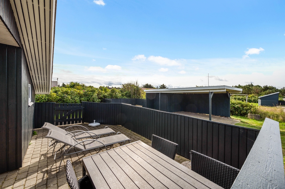Nach Süden und Westen hat das Haus eine ganz geschlossene und teilweise überdachte Terrasse sowie eine kleine offene Terrasse nach Westen. Auf der abgeschirmten Ostterrasse könnt Ihr das Frühstück genießen. Hier sind Gartenmöbel, Liegestühle und Grill vorhanden.