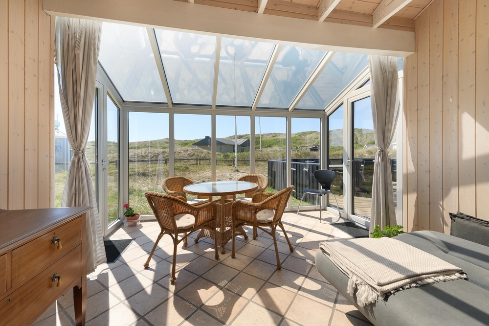 Von hier aus gelangt ihr auch in den, mit Sofa und Stühlen ausgestatteten, Wintergarten. Genießt einen schönen Ausblick auf die euch umgebende Dünenlandschaft, z. B. bei einem guten Glas Wein oder macht es euch mit einem spannenden Buch bequem. Angrenzend an den Wohnbereich findet ihr die offene und gepflegte Küche. Diese ist gut ausgestattet und bietet alles, was es zur Zubereitung leckerer Mahlzeiten benötigt.