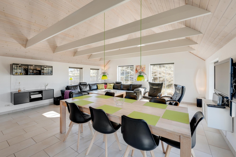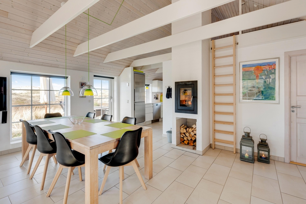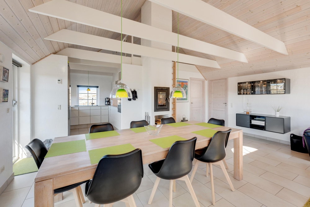 Der offene Wohnbereich mit Kamin bildet mit dem Essbereich das Zentrum des Ferienhauses, wo alle Familienmitglieder sich versammeln können, um entweder gemeinsam zu entspannen, einen spannenden Film zu schauen oder einmal wieder Karten oder Mensch ärgere dich nicht zu spielen.
