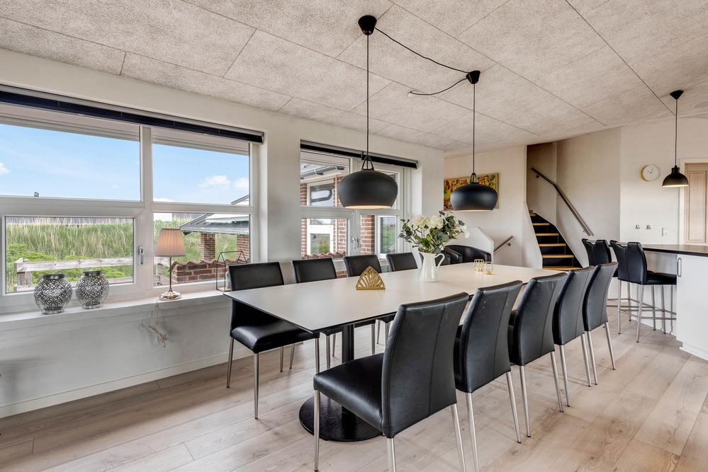 Auf versetzten Ebenen gebaut, mit Lage auf einem wunderbaren Dünengrundstück und herrlichem Blick über die Landschaft ist dieses architektonisch interessante Haus etwas ganz Besonderes. Das Ferienhaus auf Klitdalen 7 ist geschmackvoll eingerichtet und überall mit Fußbodenheizung ausgestattet. Besonders der Aktivitätsraum mit Billardtisch und Tischtennis ist ein Traum für große und kleine Spieler. Bis zu 10 Personen und 1 Hund können sich hier auf schöne Tage in Houvig an der Westküste Dänemarks freuen. Wenn ihr mit dem E-Auto anreist, dann ist eine Lademöglichkeit am Ferienhaus vohanden. Ihr benötigt dafür nur eure eigenen Ladekabel/Adapter.