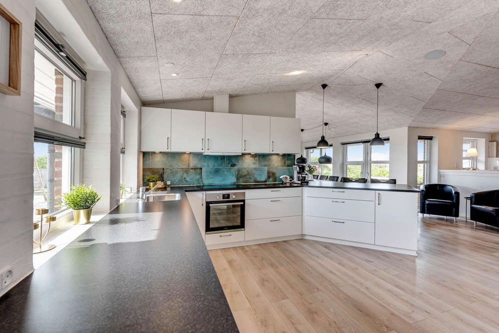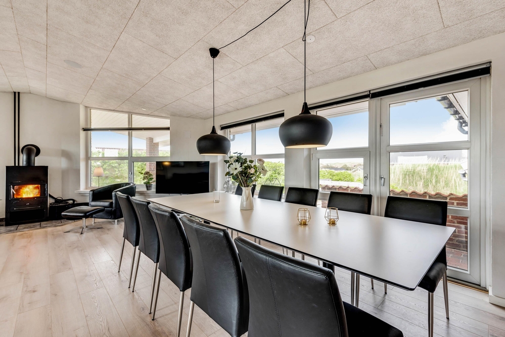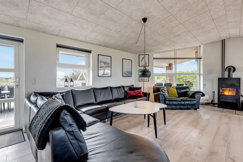 Das große und gut ausgestattete Wohnzimmer steht in offener Verbindung mit der Küche und dem Esszimmer; von hieraus könnt ihr auch die schöne Aussicht in die Landschaft genießen. Das offene Wohnkonzept sorgt dafür, dass ihr hier eine großartige gemeinsame Zeit verbringen könnt. Das Prasseln des Feuers im Holzofen trägt zu noch mehr Ferienhausatmosphäre bei, gerade an kühleren Tagen.