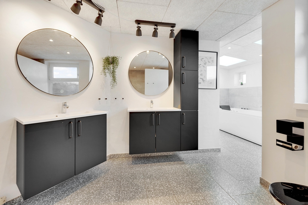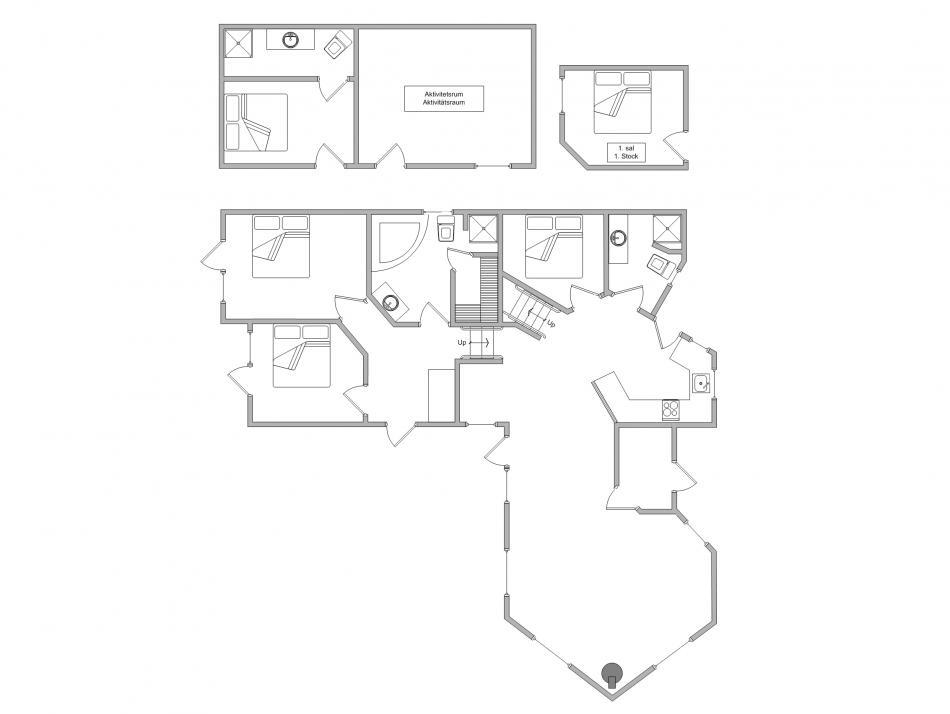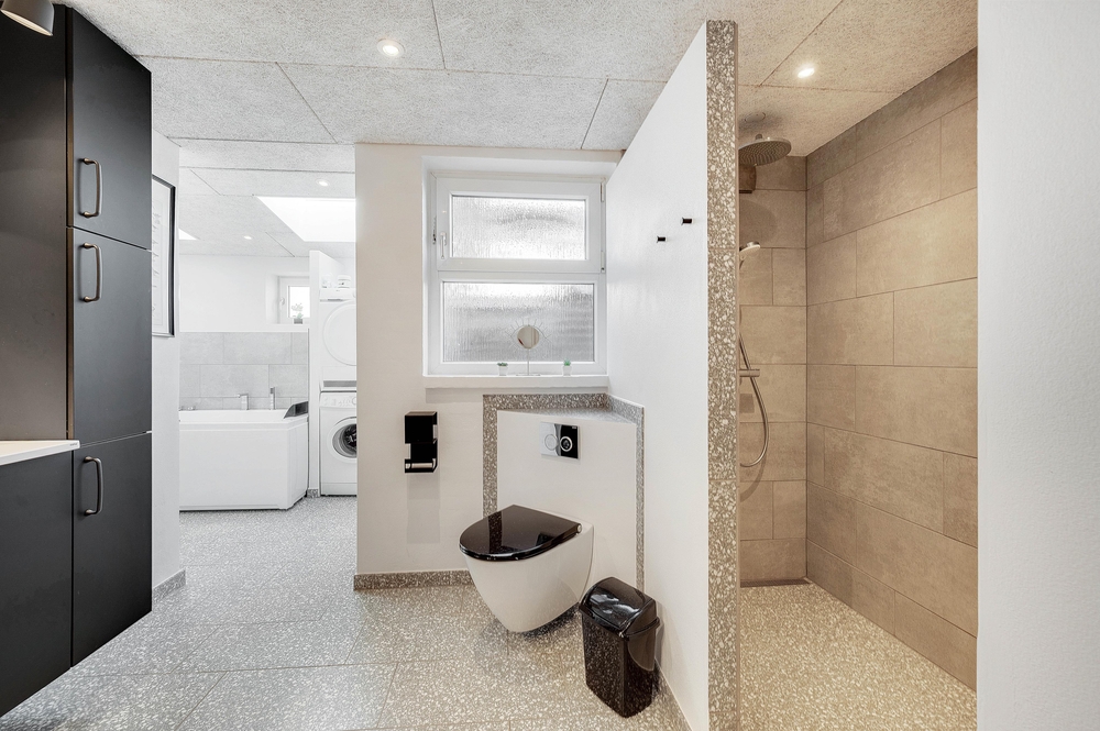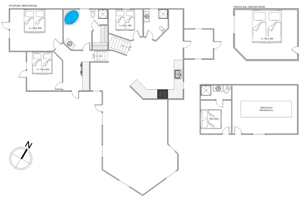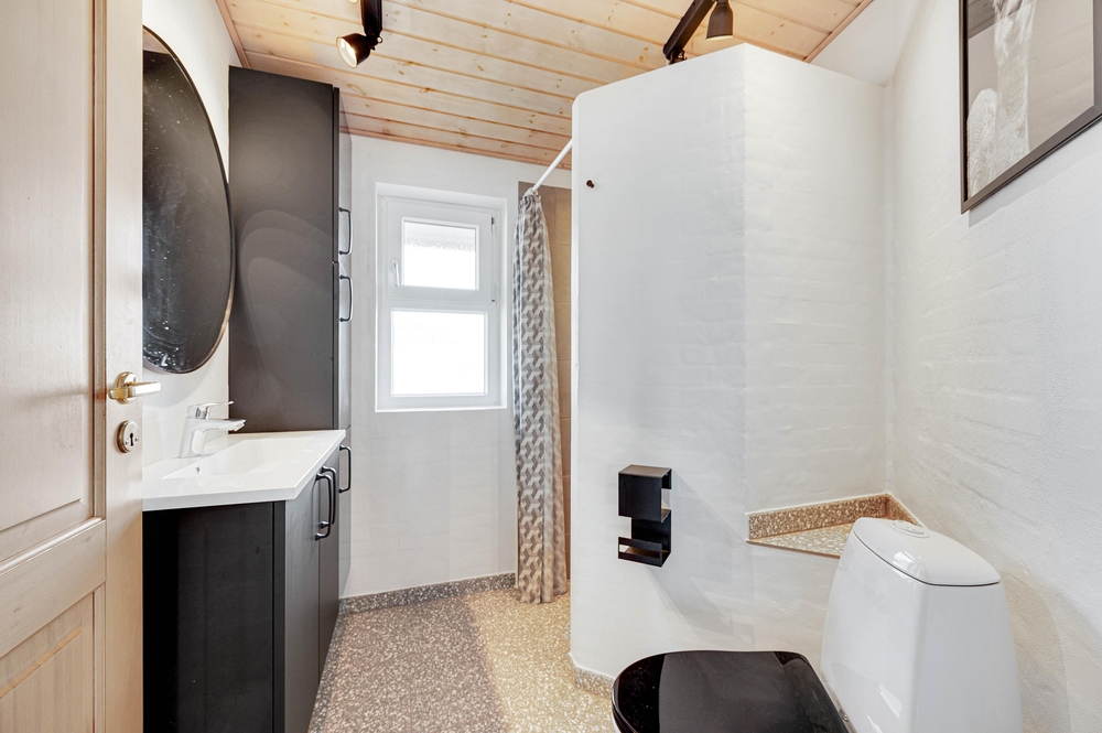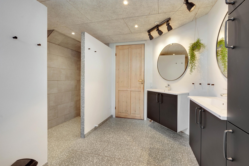 Im Hauptgebäude befinden sich 4 Schlafzimmer mit je einem Doppelbett und im Anbau (Anneks) befindet sich zusätzlich ein Schlafzimmer mit einem Doppelbett und einem Badezimmer. Dies ist besonders praktisch, wenn ihr mit mehreren Familien Urlaub machen wollt, da jeder sein eigenes Reich hat.