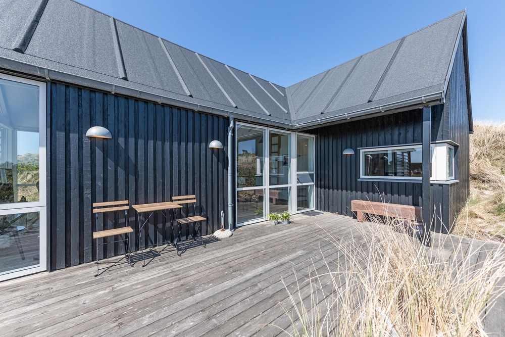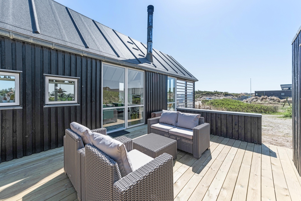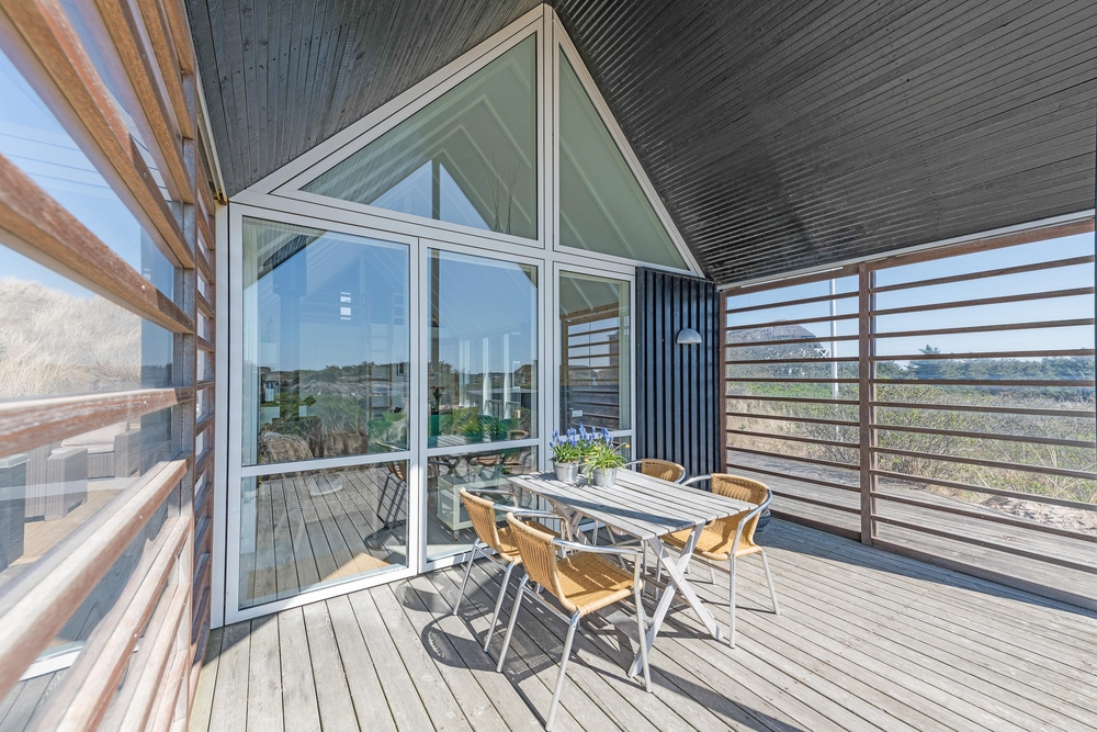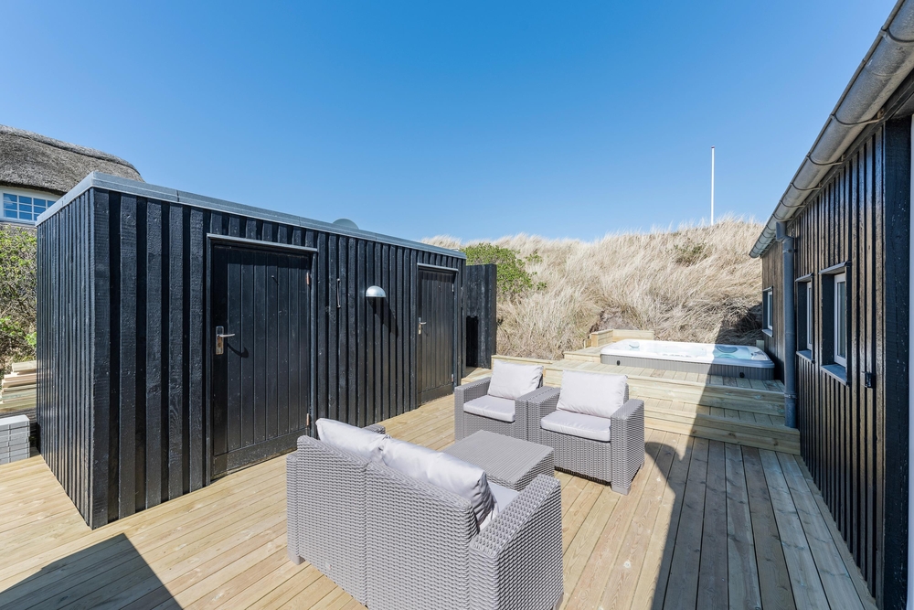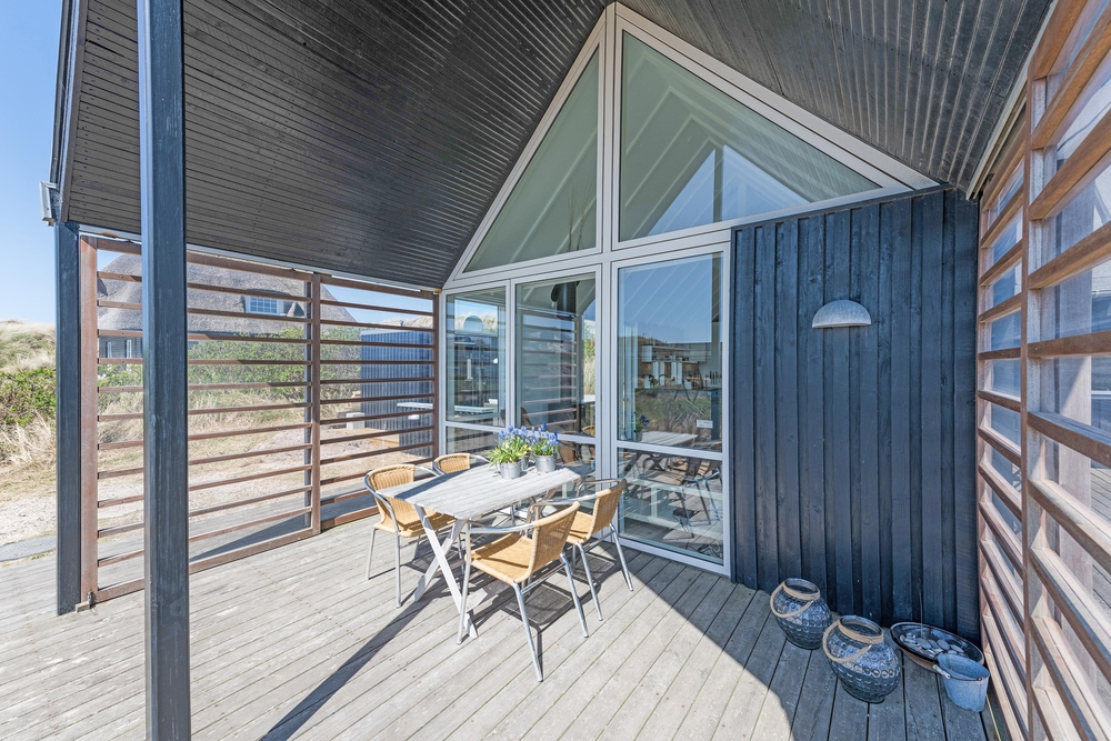 Vom Wohnraum aus habt ihr Zugang zur herrlichen, teilweise überdachten Terrasse, die sich um das ganze Haus schlängelt, sodass ihr dem Verlauf der Sonne folgen könnt. Beim Sonnenbaden könnt ihr das nahegelegene Meer rauschen hören und die schneeweißen Möwen am tiefblauen Himmel beobachten. Einen warmen Sommertag könnt ihr auf der tollen überdachten Terrasse mit gläsernem Windschutz bei einem gemütlichen Grillabend ausklingen lassen, während im Westen die Sonne hinter den Dünen untergeht.