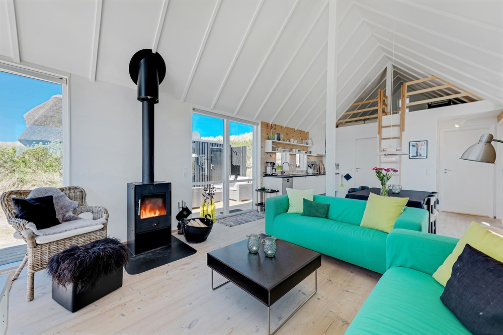 Mittelpunkt des Hauses ist der schöne, mit geschmackvollen Möbeln eingerichtete Wohnraum in Kombination mit der modernen gut ausgestatteten Küche. Der lichtdurchflutete Raum lädt zu vielen schönen gemeinsamen Ferienstunden ein. An kühleren Tagen verbreitet der knisternde Kaminofen eine wohlige Wärme, während draußen der raue Westwind die Dünengräser neigt.