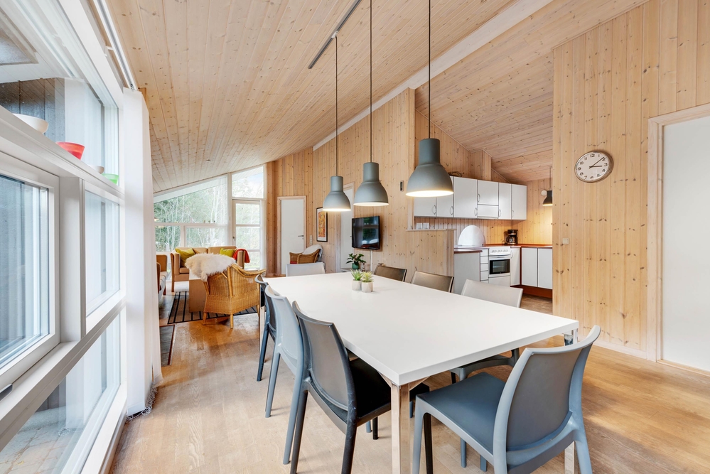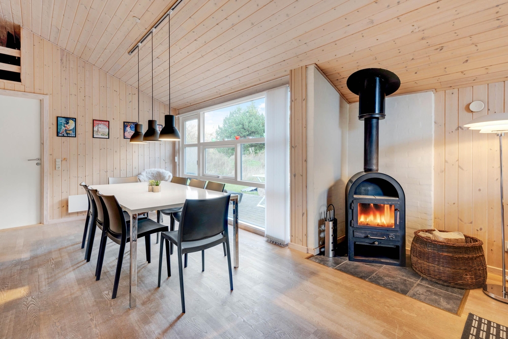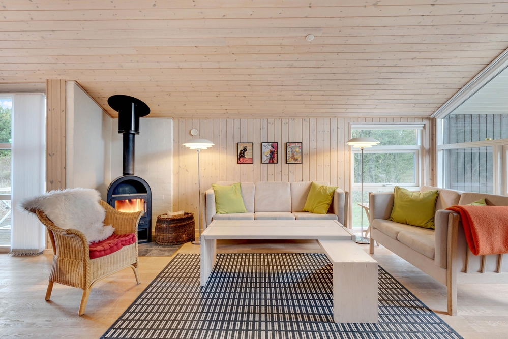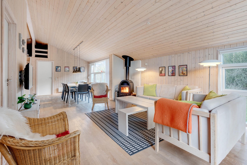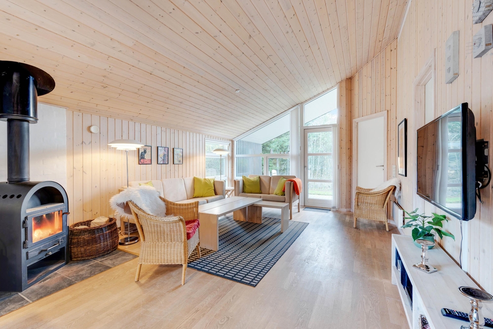 Das Ferienhaus hat eine gemütliche Einrichtung, die eine warme und gemütliche Ferienhausatmosphäre schafft. Die hellen Holzböden und die hohen Decken tragen zu dem charmanten Stil bei, und der offene Wohn- und Küchenbereich bietet viel Platz für geselliges Beisammensein und Gemütlichkeit. Die Essküche und das schöne Wohnzimmer mit Holzofen sind der Mittelpunkt in diesem charmanten Ferienhaus und bieten euch genügend Platz, die nächsten spannenden Aktivitäten für eure Urlaubstage zu planen. Die offene Küche ist modern eingerichtet und bietet alles, was ihr für die Zubereitung leckerer Mahlzeiten benötigt. Hier könnt ihr gemeinsam kochen und gleichzeitig mit der Familie oder mit Freunden im Wohnzimmer zusammensitzen.