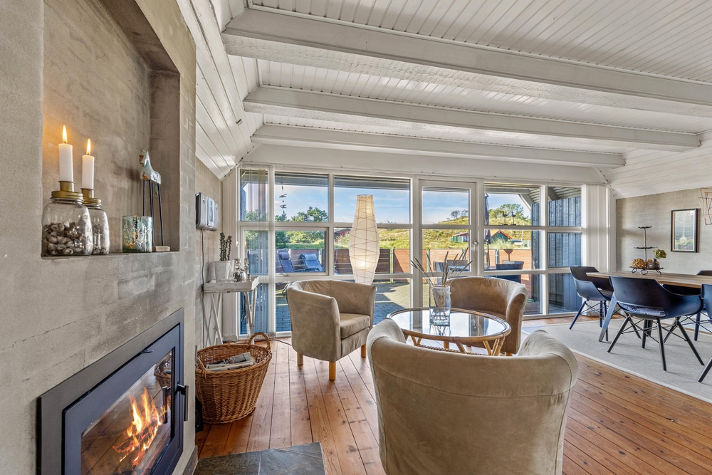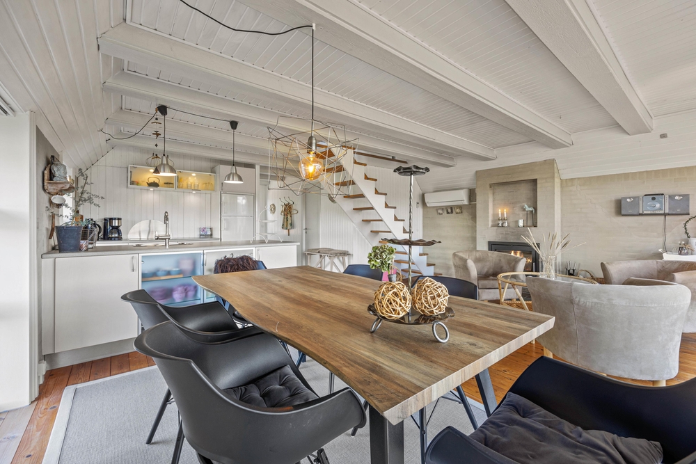 Die 85 Quadratmeter des Ferienhauses verteilen sich auf zwei Etagen und umfasst ein schönes Familienzimmer im Erdgeschoss, in dem die Küche und der Essbereich sorgfältig kombiniert sind. Hier könnt ihr köstliche Mahlzeiten zubereiten und sie gemeinsam genießen, während das sanfte Knistern des Kaminofens den Raum erfüllt. Die Inneneinrichtung ist hell und luftig und die neutralen Farbtöne schaffen eine gemütliche und entspannende Atmosphäre.