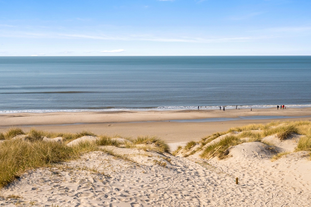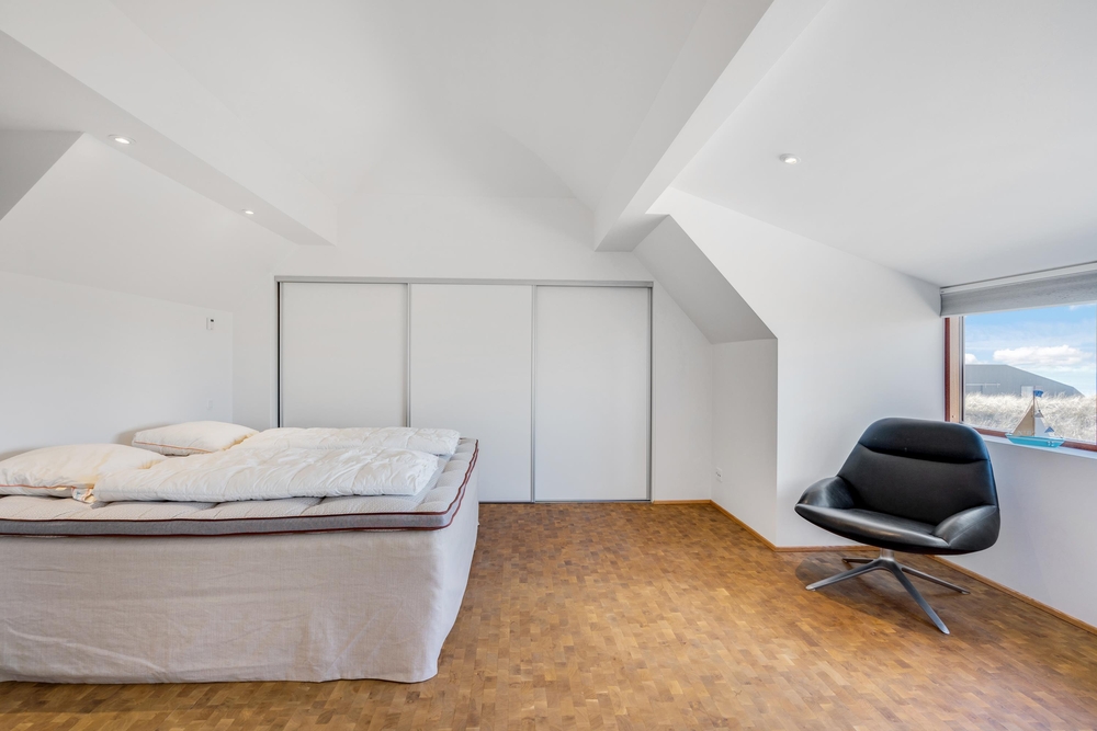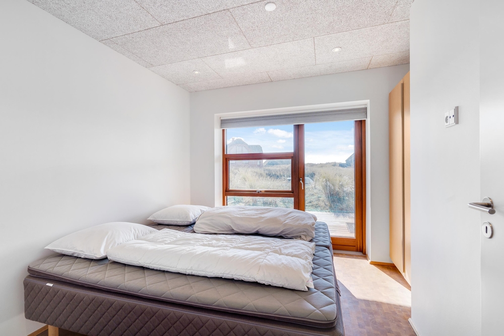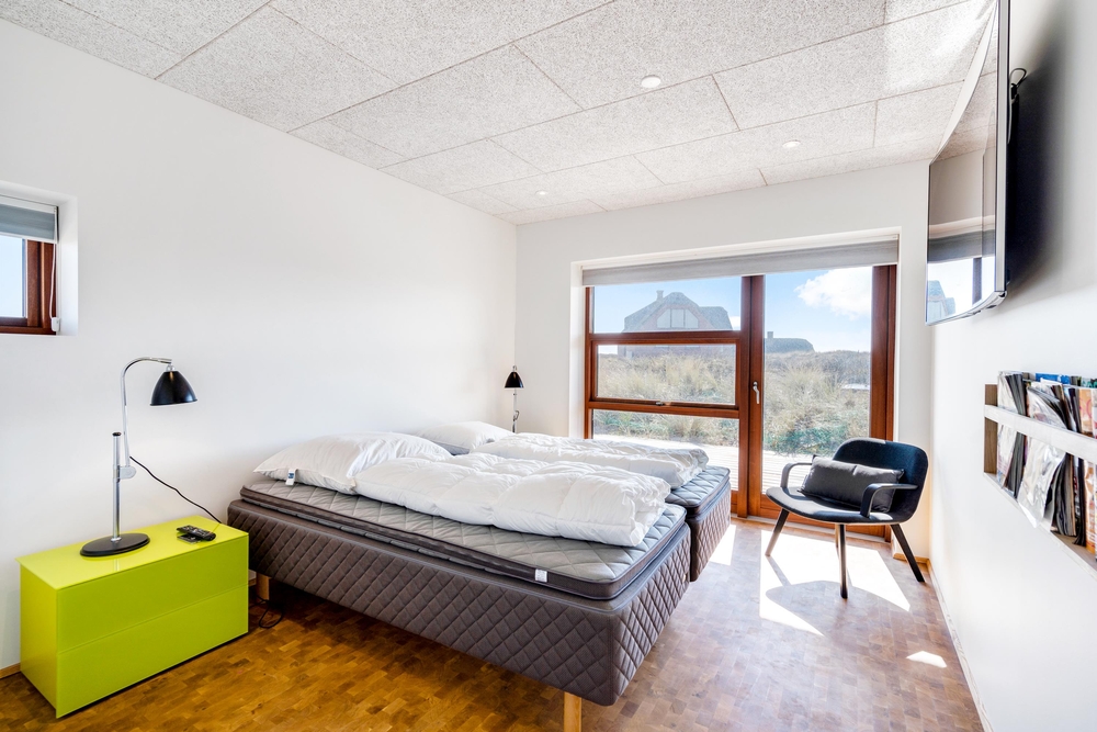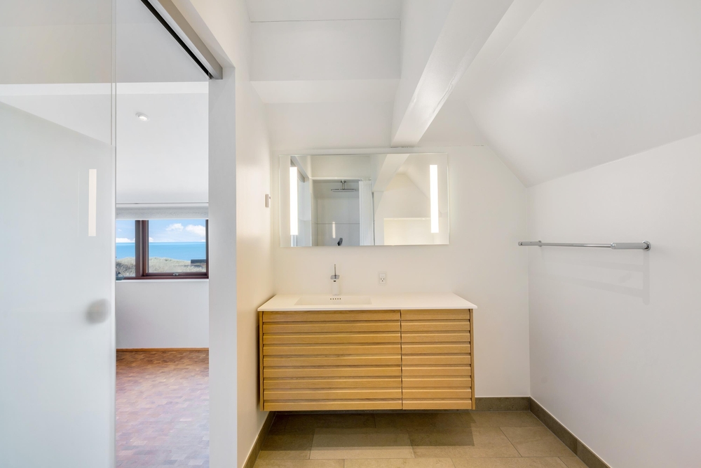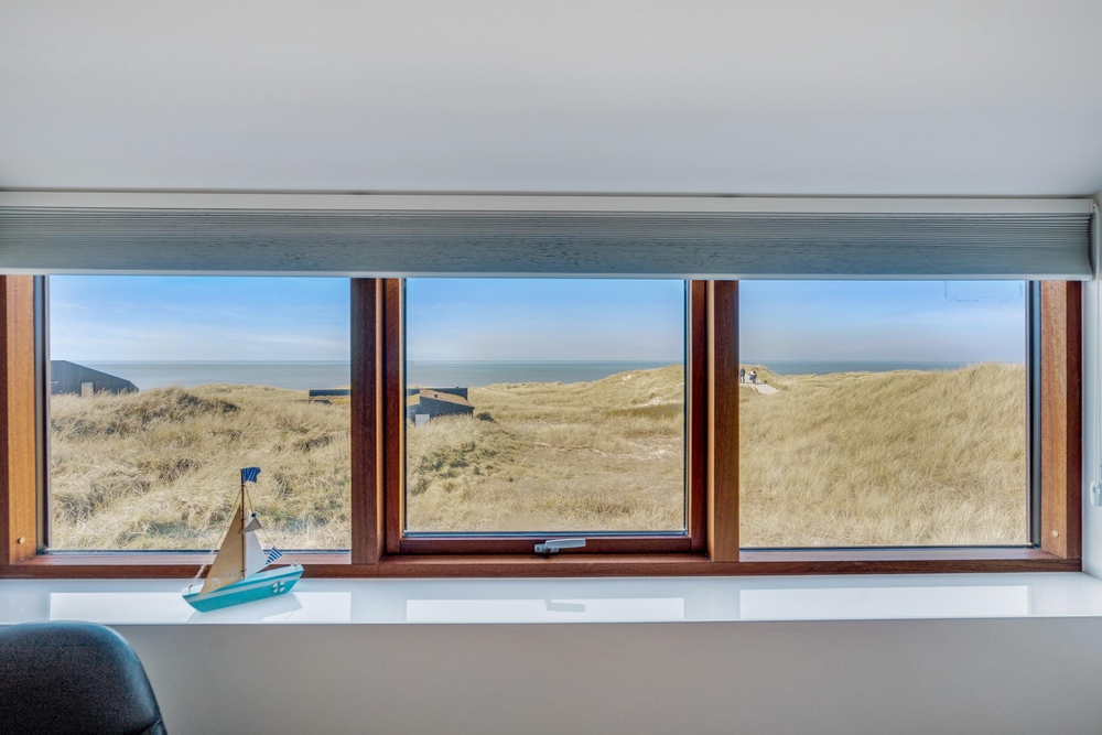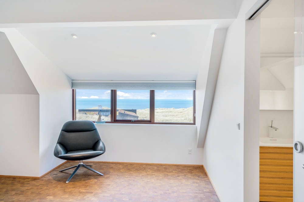 Ein Schlafzimmer mit angrenzendem Badezimmer liegt im Obergeschoss des Hauses und von hier habt ihr eine sagenhafte Panoramaaussicht über die Dünenlandschaft bis hin zum Meer. Es ist einfach herrlich, hier aufzuwachen und den Tag mit dieser tollen Aussicht zu beginnen!