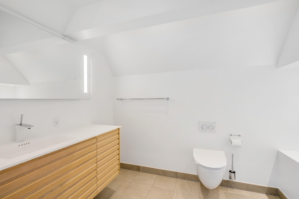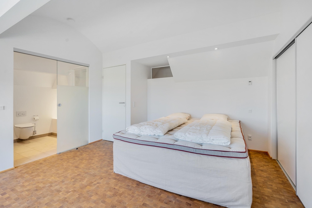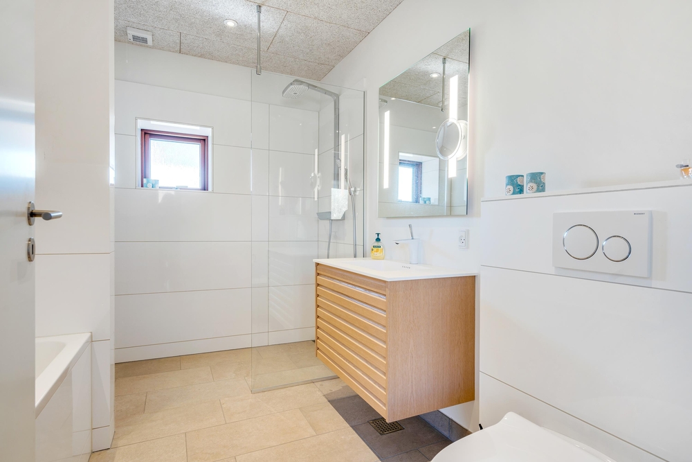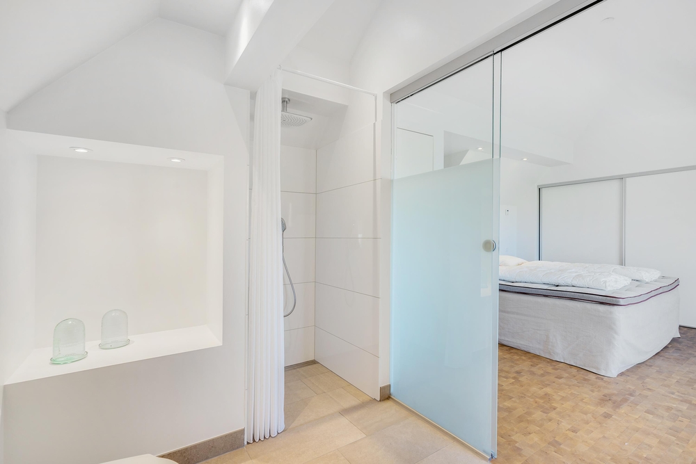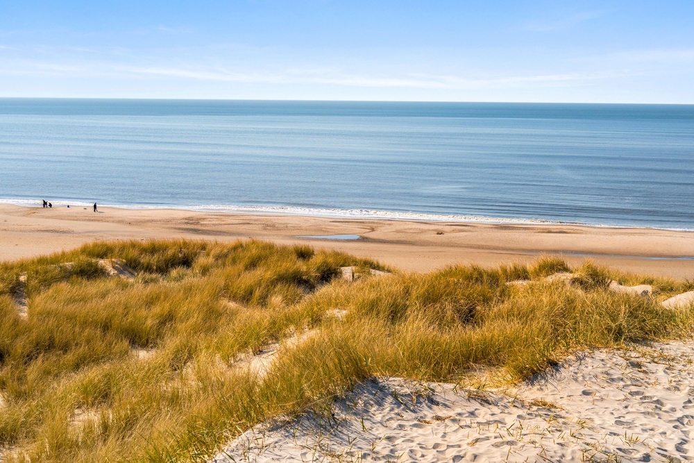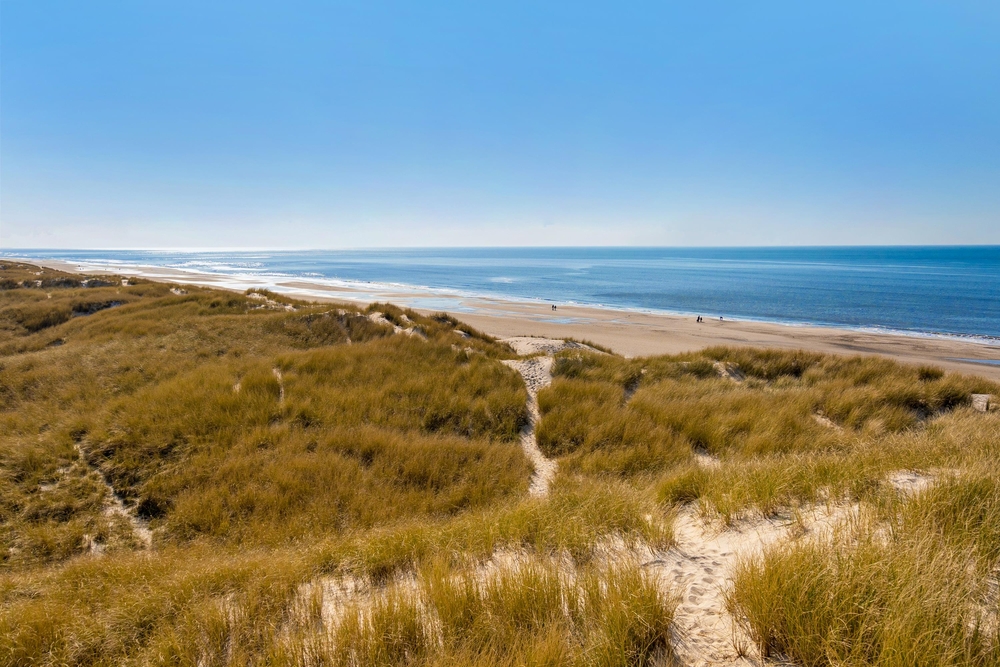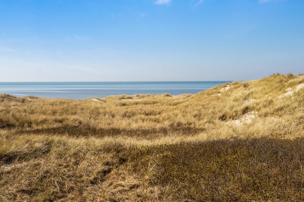 Ein Schlafzimmer mit angrenzendem Badezimmer liegt im Obergeschoss des Hauses und von hier habt ihr eine sagenhafte Panoramaaussicht über die Dünenlandschaft bis hin zum Meer. Es ist einfach herrlich, hier aufzuwachen und den Tag mit dieser tollen Aussicht zu beginnen!
