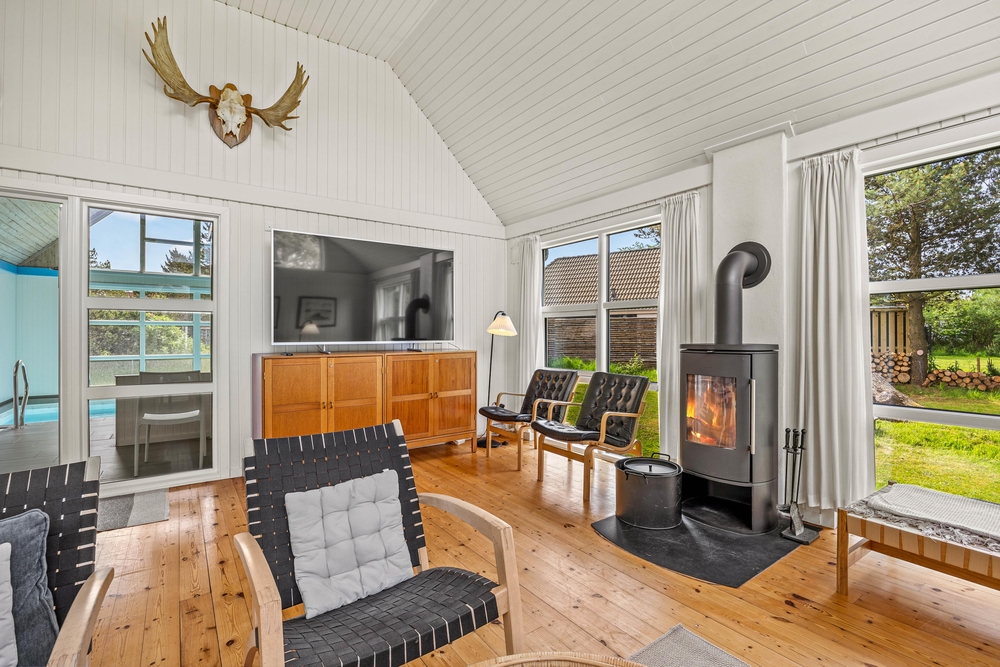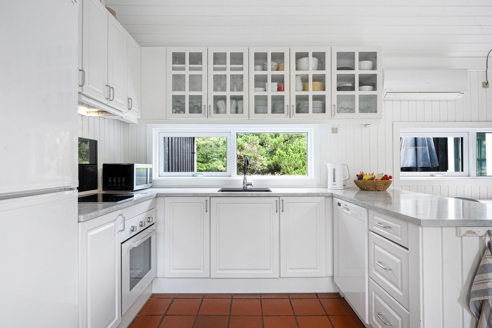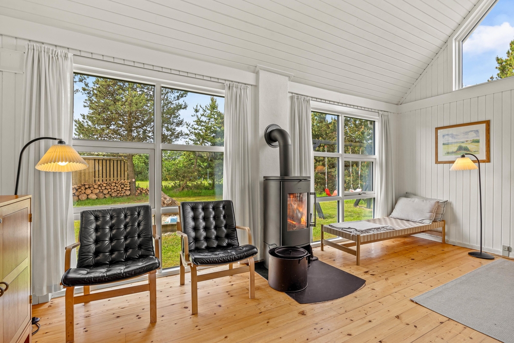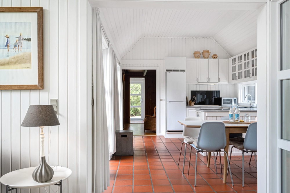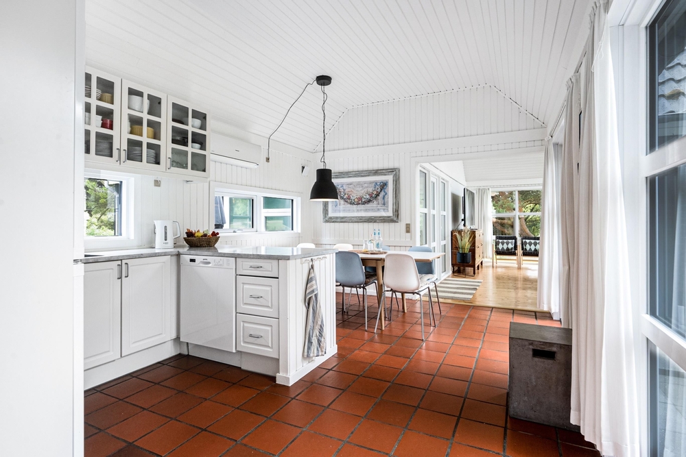 Herzstück des Sommerhauses auf Kollemarken 61 ist das Wohnzimmer, wo ihr euch sofort wohl fühlt. Der hohe Raum ist durch die vielen Fenster und das weiß gestrichene Holz sehr hell, wobei der Holzfussboden in Kombination für eine kuschelige Gemütlichkeit sorgt. Macht abends den Kamin an, lasst euch von seiner wohligen Wärme umarmen, während ihr einen Film über Chromecast streamt.