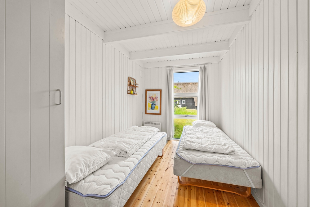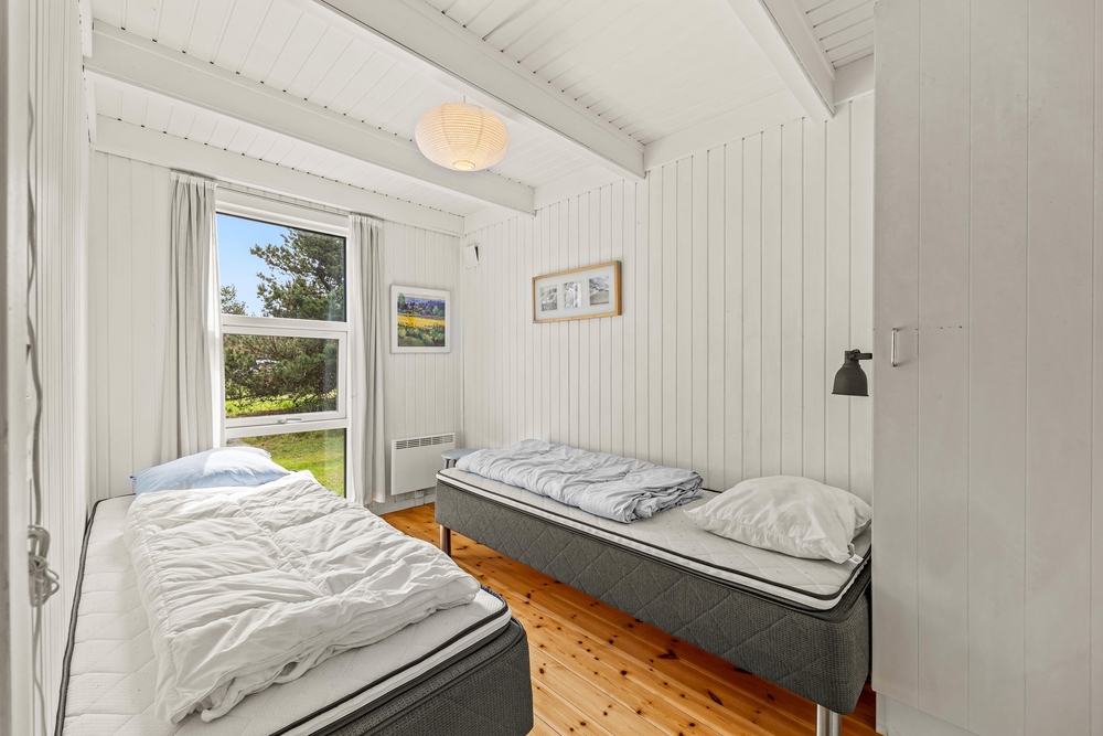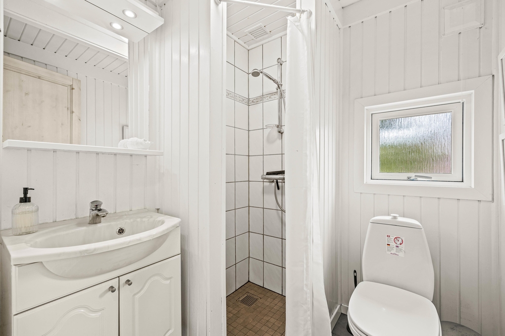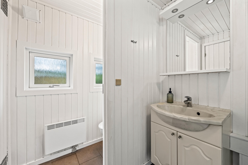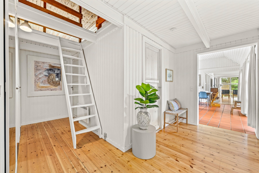 Herzstück des Sommerhauses auf Kollemarken 61 ist das Wohnzimmer, wo ihr euch sofort wohl fühlt. Der hohe Raum ist durch die vielen Fenster und das weiß gestrichene Holz sehr hell, wobei der Holzfussboden in Kombination für eine kuschelige Gemütlichkeit sorgt. Macht abends den Kamin an, lasst euch von seiner wohligen Wärme umarmen, während ihr einen Film über Chromecast streamt.