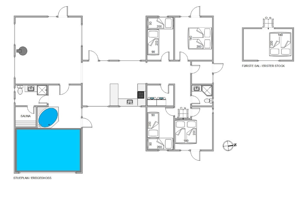 Auf Kollemarken 61 begrüßt euch dieses große Poolhaus für 10 Personen. Das Ferienhaus ist mit Pool, Whirlpool und Sauna ausgestattet und bietet 4 Schlafzimmer samt Schlafboden. 1500m² großes Rasengrungstück ist ideal für die Kinder zum Spielen und Toben. Die Brötchen für das gemeinsame Frühstück könnt ihr direkt in Blåvand erwerben.